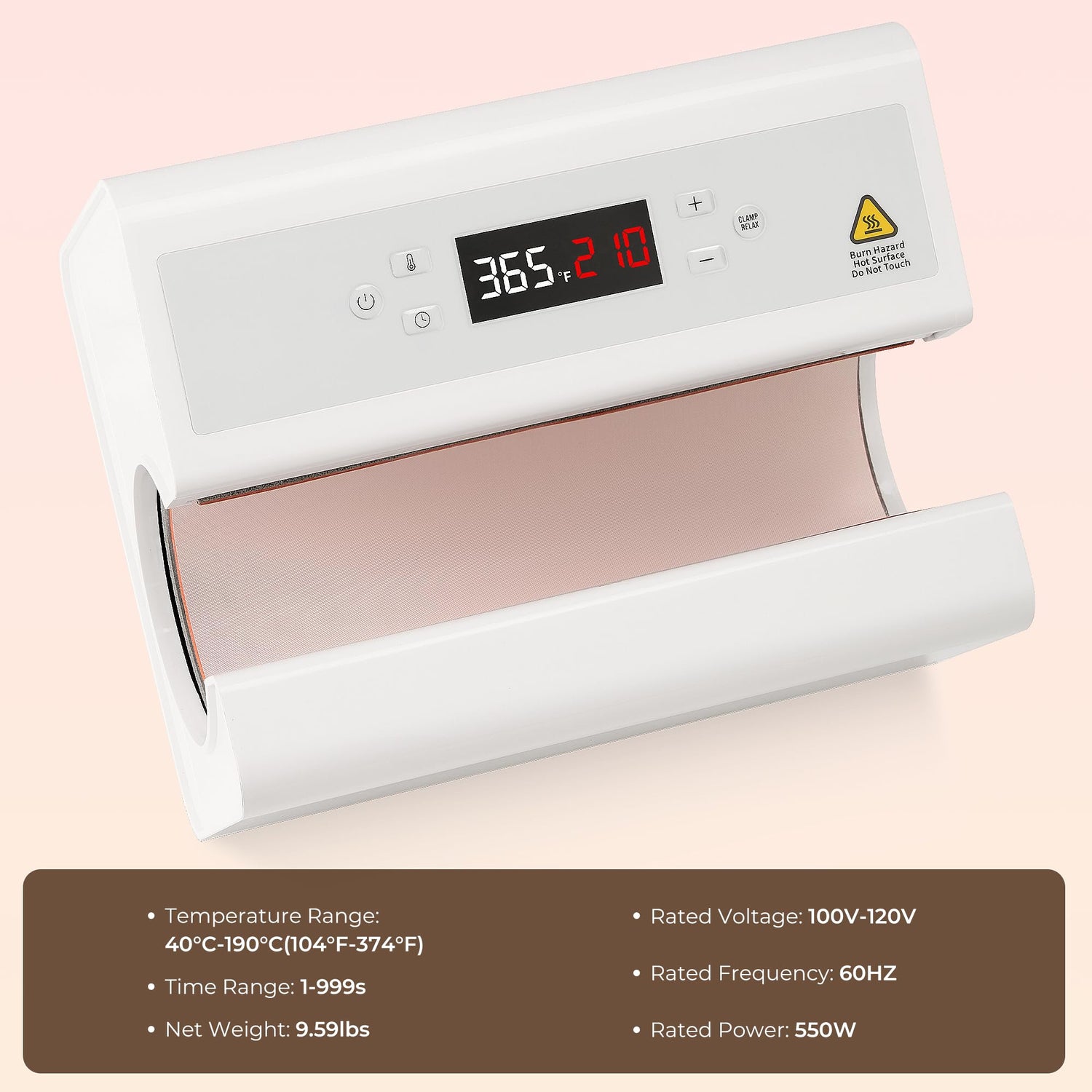 - Wide Range of Applications: The sublimation cup press machine can accommodate a maximum diameter of 3.35 inches (8.5cm), a maximum capacity of 30oz (887ml), and a maximum height of 10.6 inches (25cm), suitable for 11-30oz sublimation tumblers, mugs, glass cups, water bottle