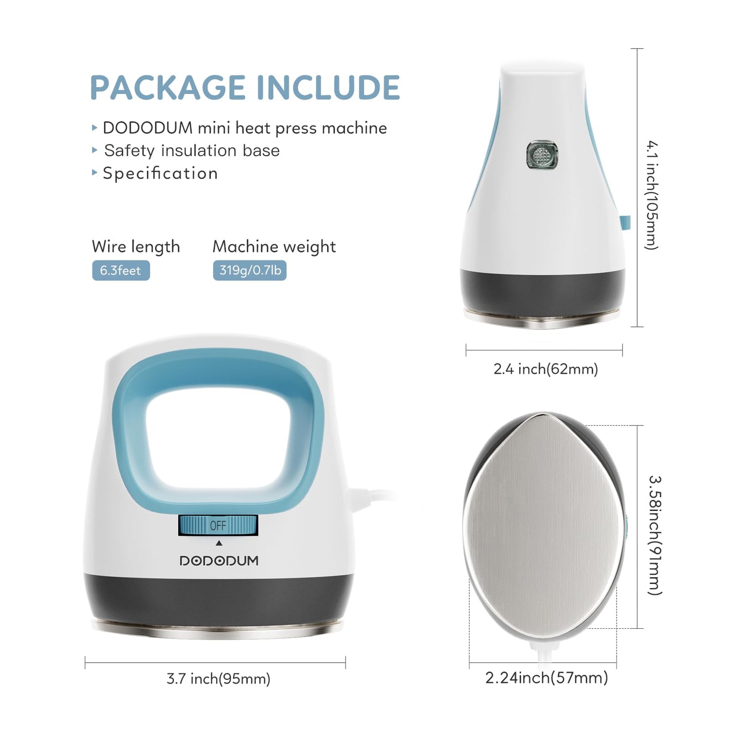 • DODODUM small Heat Press machine is very small and easy to carry. Designed with new knobs to control the temperature, which makes them less touchable and more ergonomic, they improve the performance of the Heat Press machine, heat up faster, and save you more time. Furthermore, the Heat Press Mini machine is equipped with an insulated safety base to prevent burns by accident.