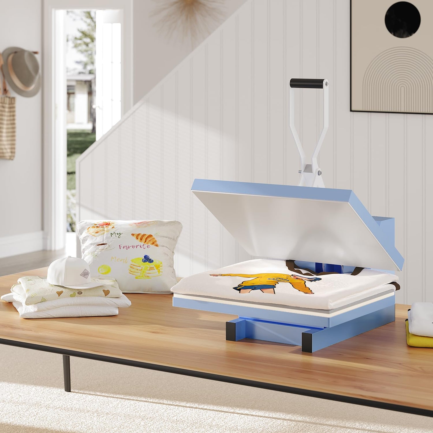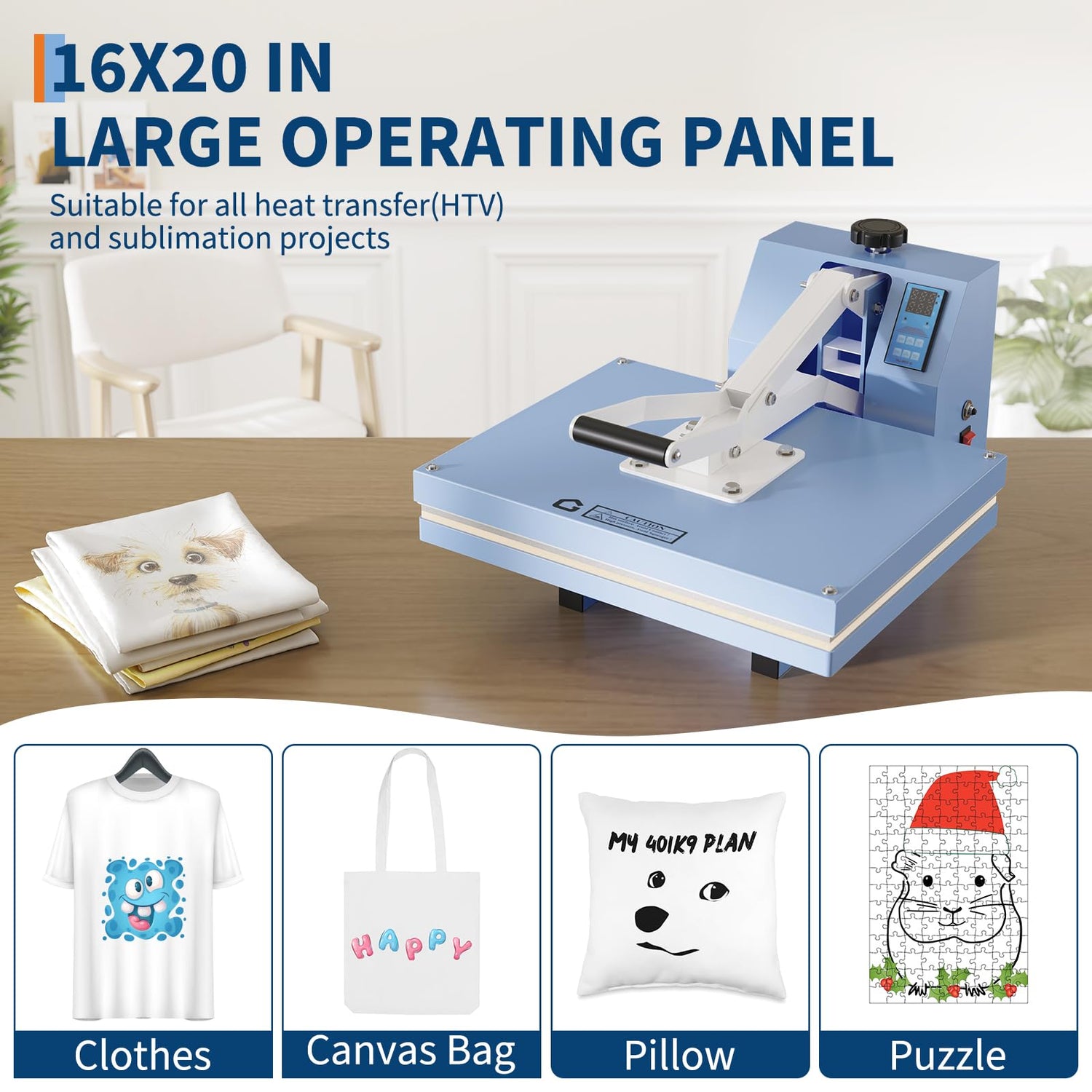Heat Press, 16x20 Inch Machine, Fixed Clamshell Heat Transfer Machine for T-Shirts, Hats, Bags, Sublimation with Digital Display, 110V US Plug, Mist Blue