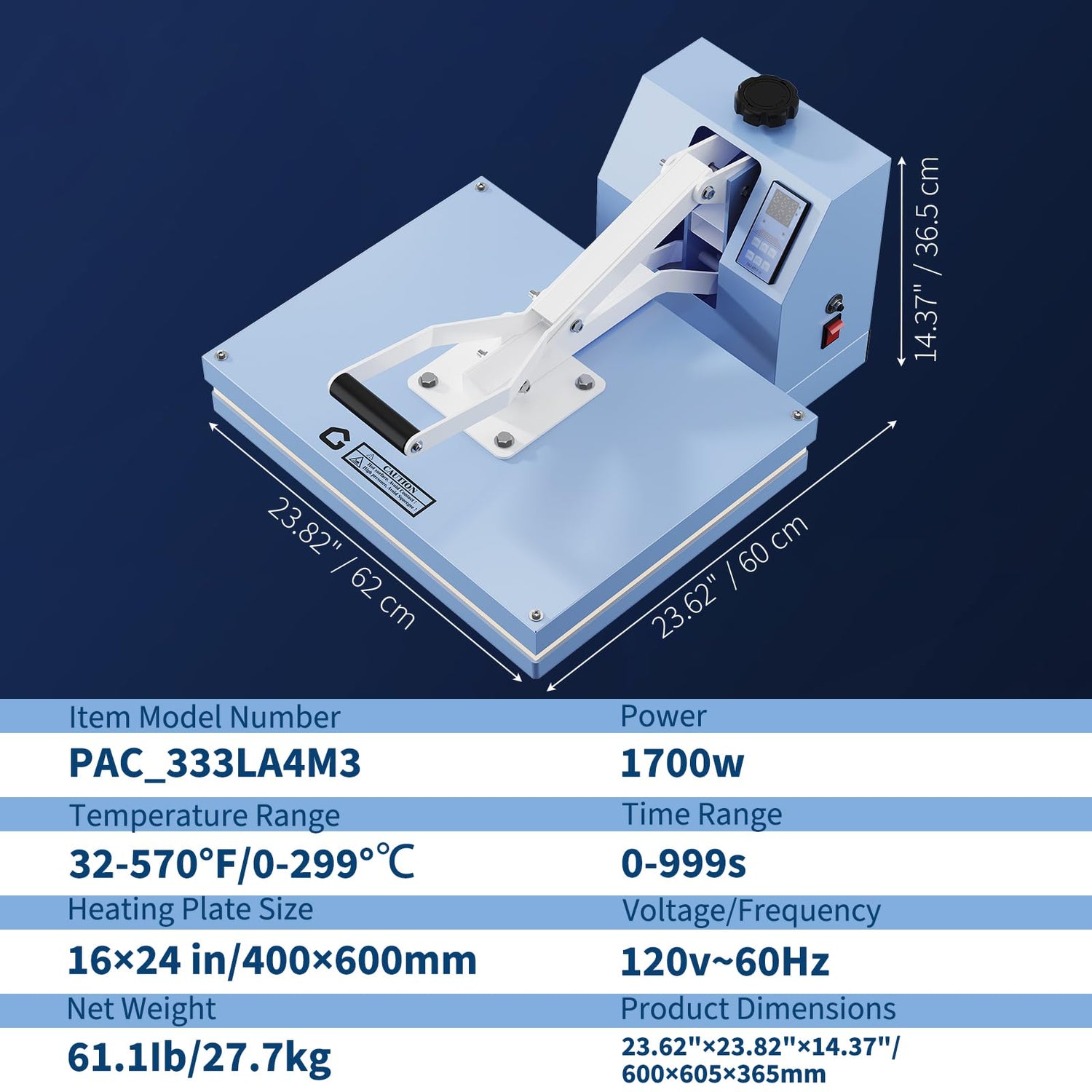 - Heat press with a generous 16x24 inch heating area, ideal for various garment sizes and materials