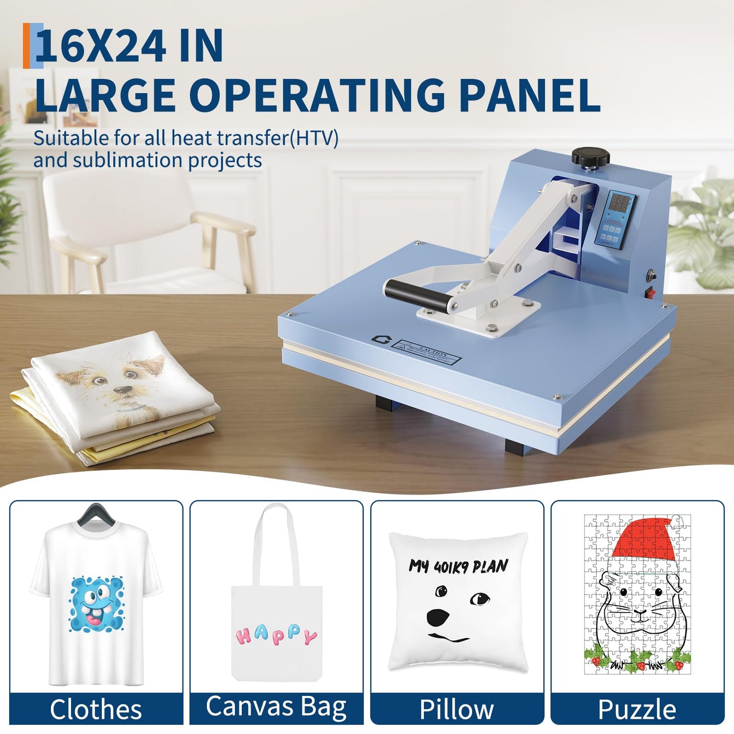• 【Versatile Multi-Use Compatibility】: The spacious 16x24 heat press accommodates transfers onto shirts, hoodies, pants, pillows, bags, and tiles. Perfect as a heat press machine clamshell for small businesses or hobbyists, it supports endless creative applications, making it an ideal shirt press machine for personalized or commercial use.