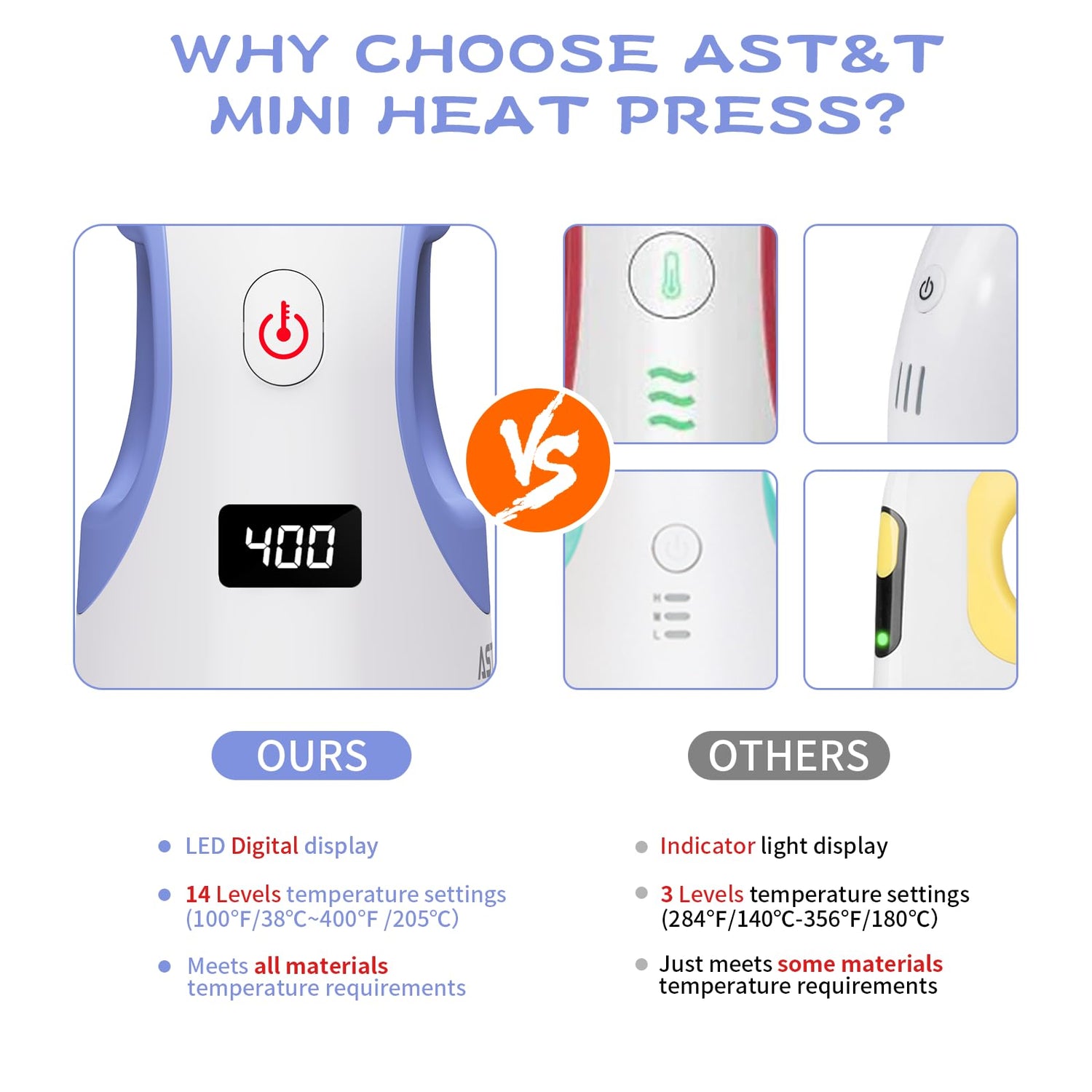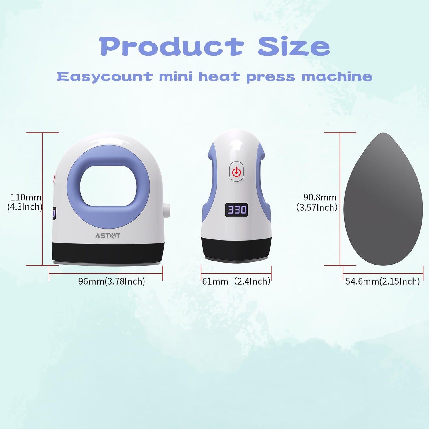 - AST&T mini heat press machine(3.7x2.4x4.3inch)οΌwhich is smaller than the others heat press, itβs easy to carry around. Customize and personalize patterns for your clothing, handbags, tote bags, phone cases, etc,make it fun with our heat press.