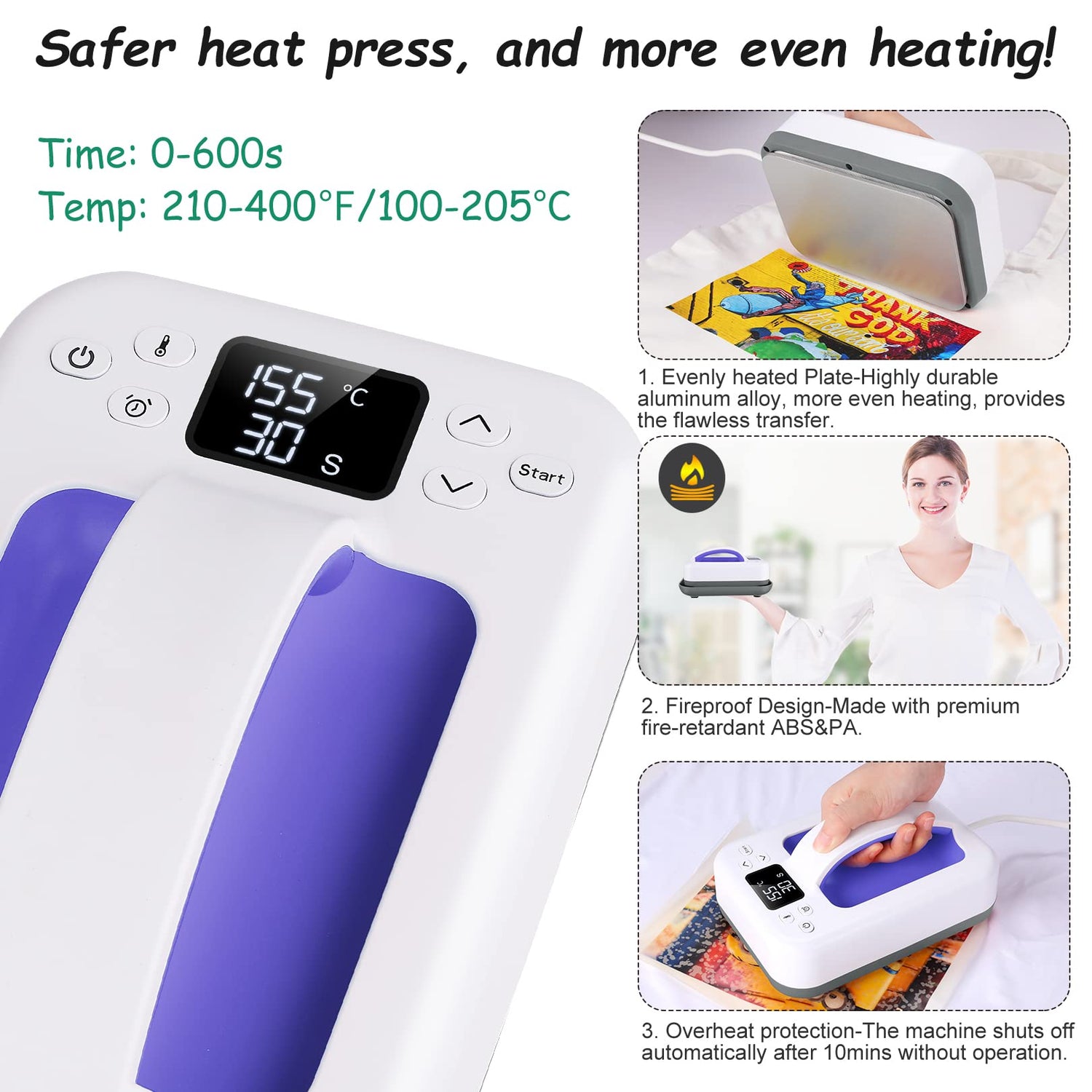 - 【Perfect size and durable】Our small heat press are 7×4.8inch, perfect for different sizes of clothes, and patterns twice as big as the heat press can be easily transferred. You can make shirts for everyone, whether children or adults, store operations, or home use. This mini heat press is small in size and light in weight, which is very convenient to store and carry. It's the best gift for your family.