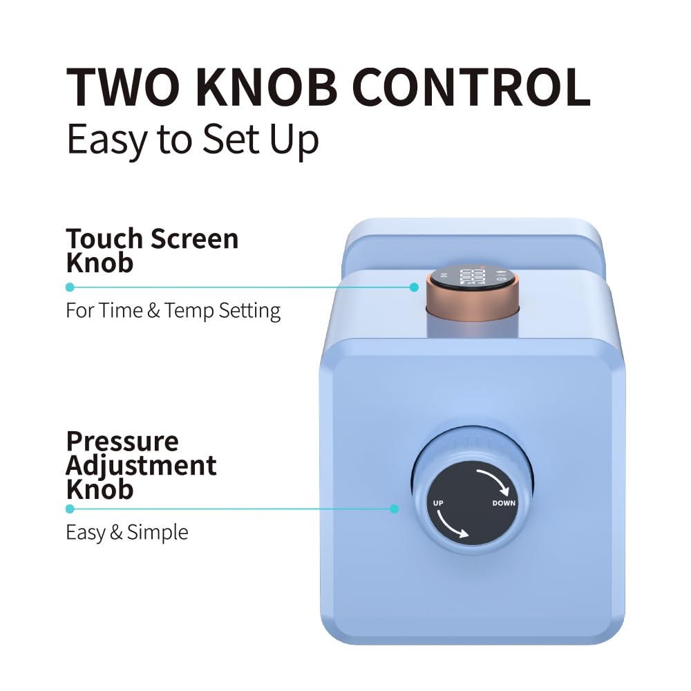 - Two Knob Control:The mug press machine with two knob control,the touch screen knob on the top is for time and temp setting.The knob on the right side is for manual adjustable pressure.