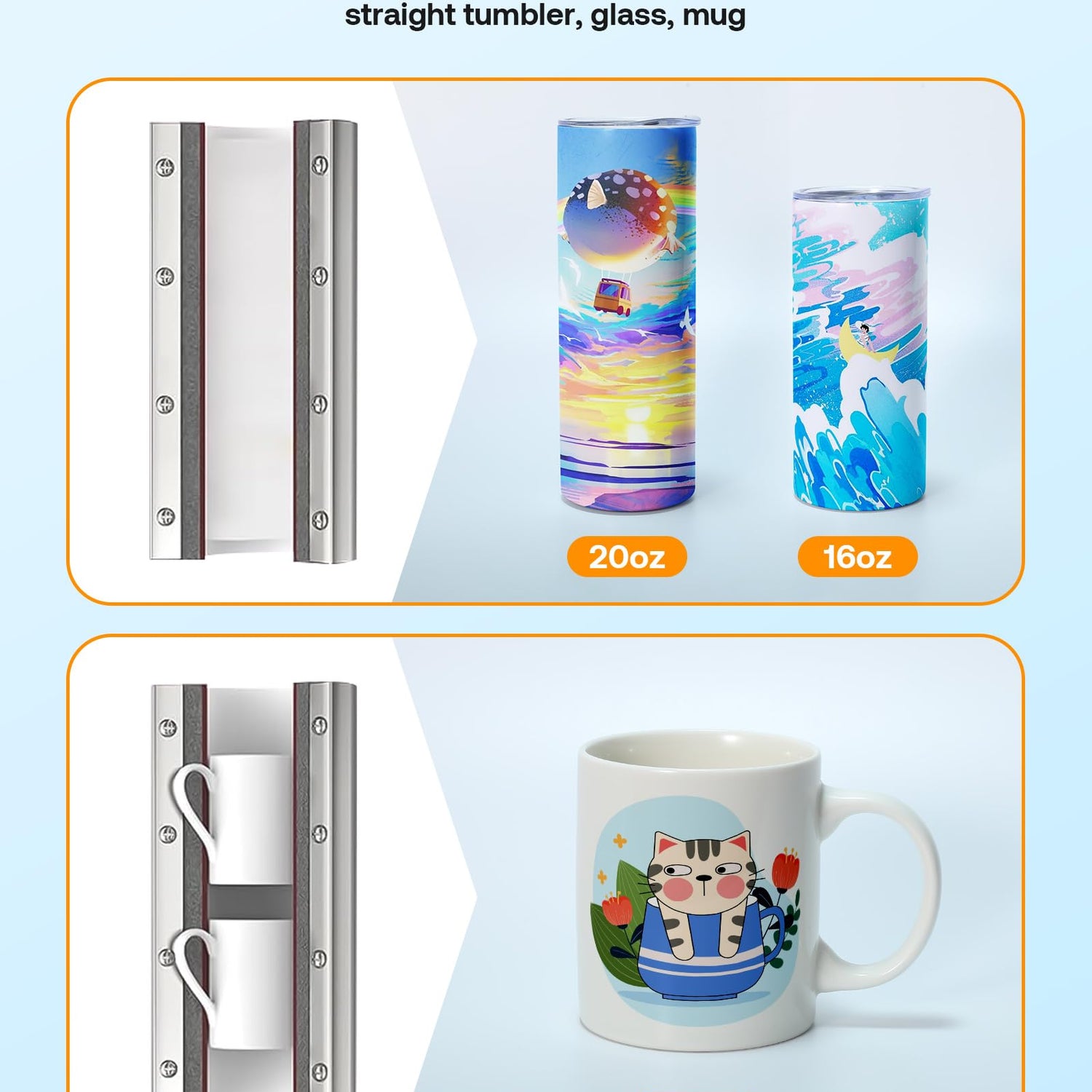 • 【Efficient Tumbler Heat Press】The tumbler mug press is suitable for 12-30oz straight skinny sublimation tumblers, 2pcs 11oz or 15oz sublimation mugs at one time, and more. Compared with sublimation ovens, the tumbler press heats faster, more evenly, and performs more stability.