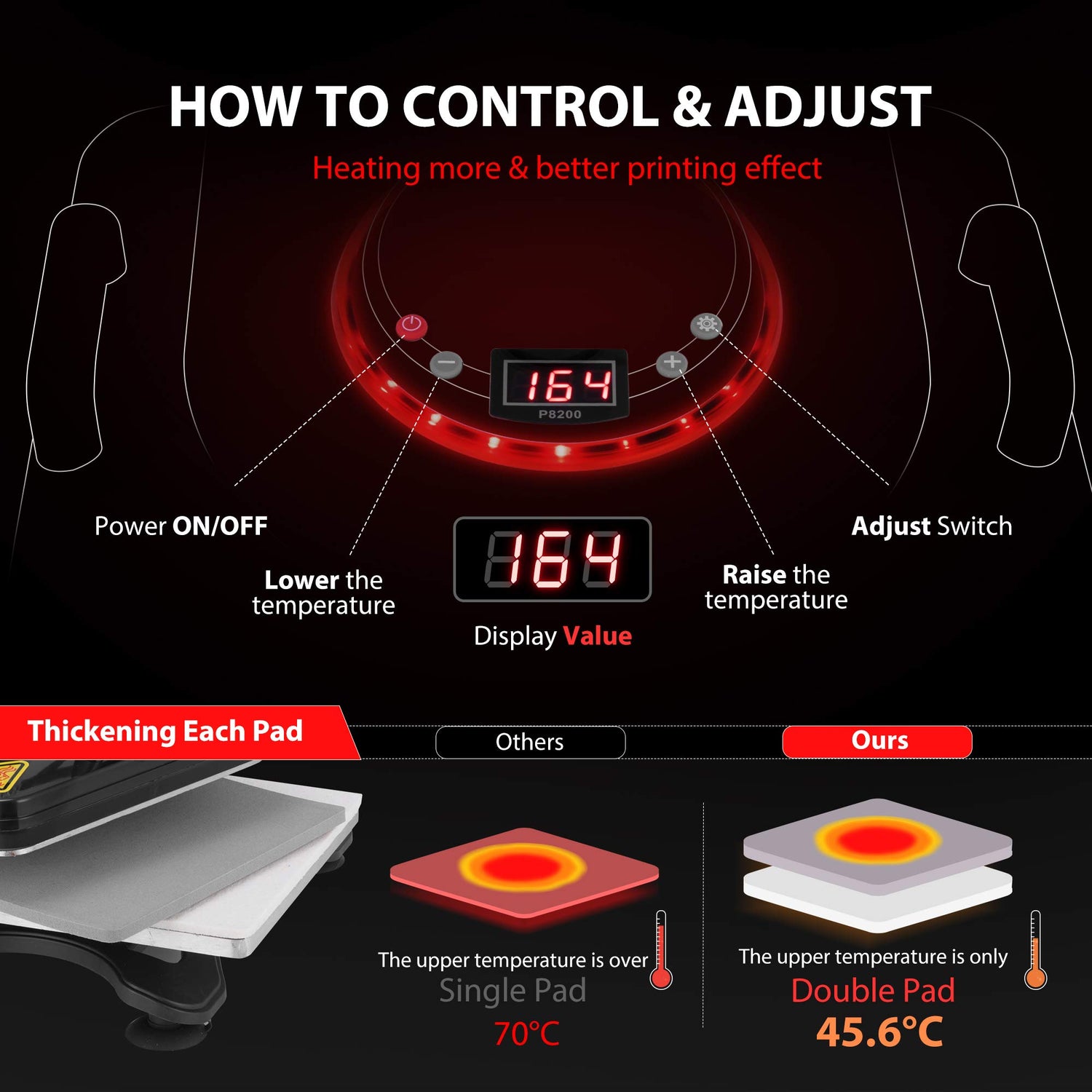 • THE OUTSTANDING DESIGN - With a swing-away and guide rail design, the heat press machine can provide a full range press directly and evenly, keeping the high quality of finished transfers