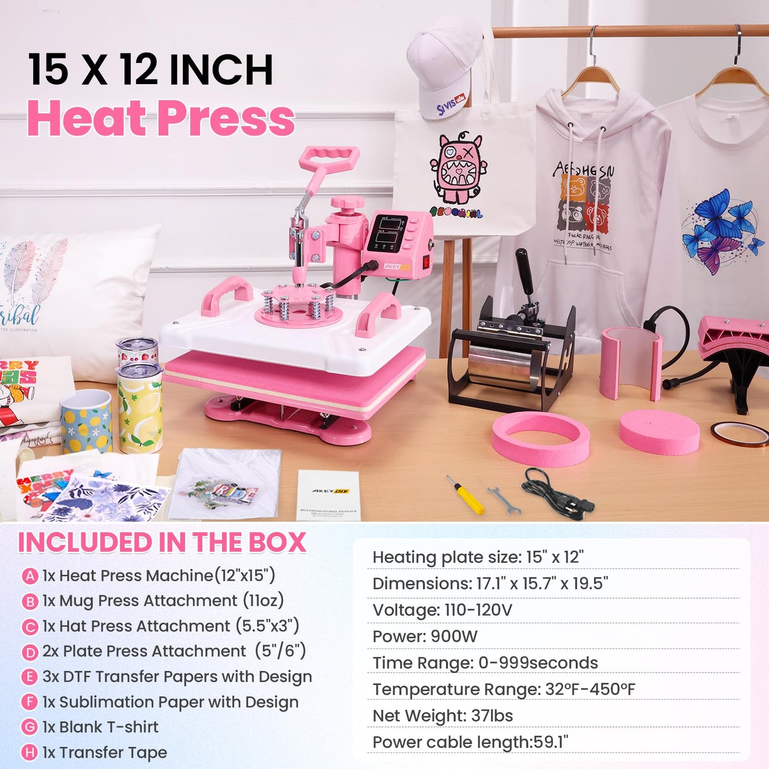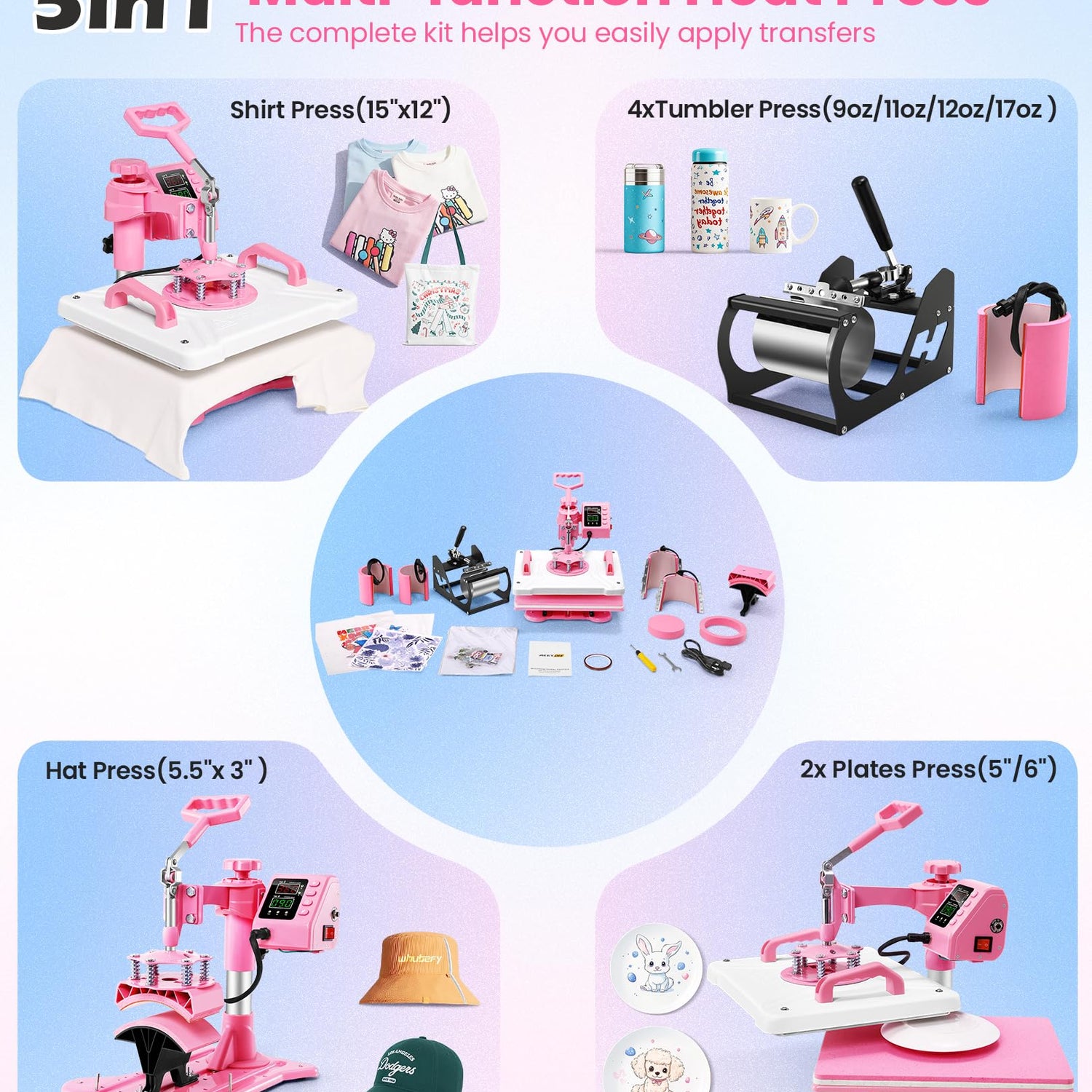 • 🎨5-IN-1 VERSATILE HEAT PRESS:It is equipped with a 12"x15" inch Heat Press Machine for Tshirt, 5.5"x3" Hat press for caps, 11oz tumbler press, a 6" Plate Press, and a 8" Plate Press. Bonus starter kit included: 3 DTF/1 sublimation papers, 1 blank tee & 1 tape. Perfect for side hustles – make merch for Etsy, school teams, or family gifts