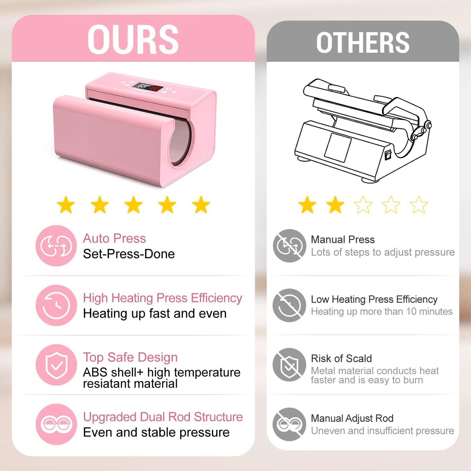 • 🎨DITCH THE BASIC MUGS, MAKE GIFTS THAT STICK:This Press Machine is designed for 10-30oz cups with diameters of 2.9-3.34in.Sick of grabbing the same old mugs from the store? This pink press lets you slap family pics, inside jokes, or holiday vibes on 11-15oz mugs—perfect for Mom’s day, birthdays, or just because. Even if you’ve never crafted a thing, you’ll crank out pro-level gifts that feel personal, not picked up at the mall.