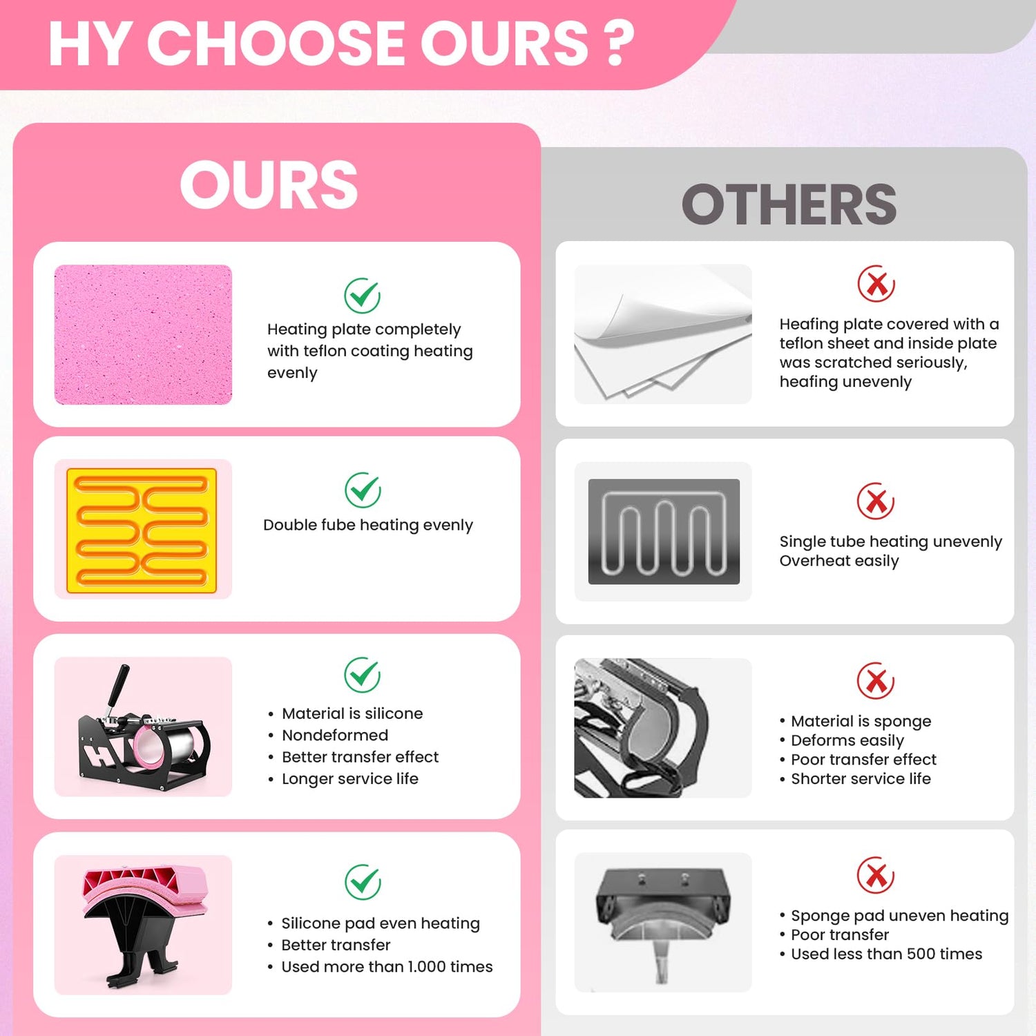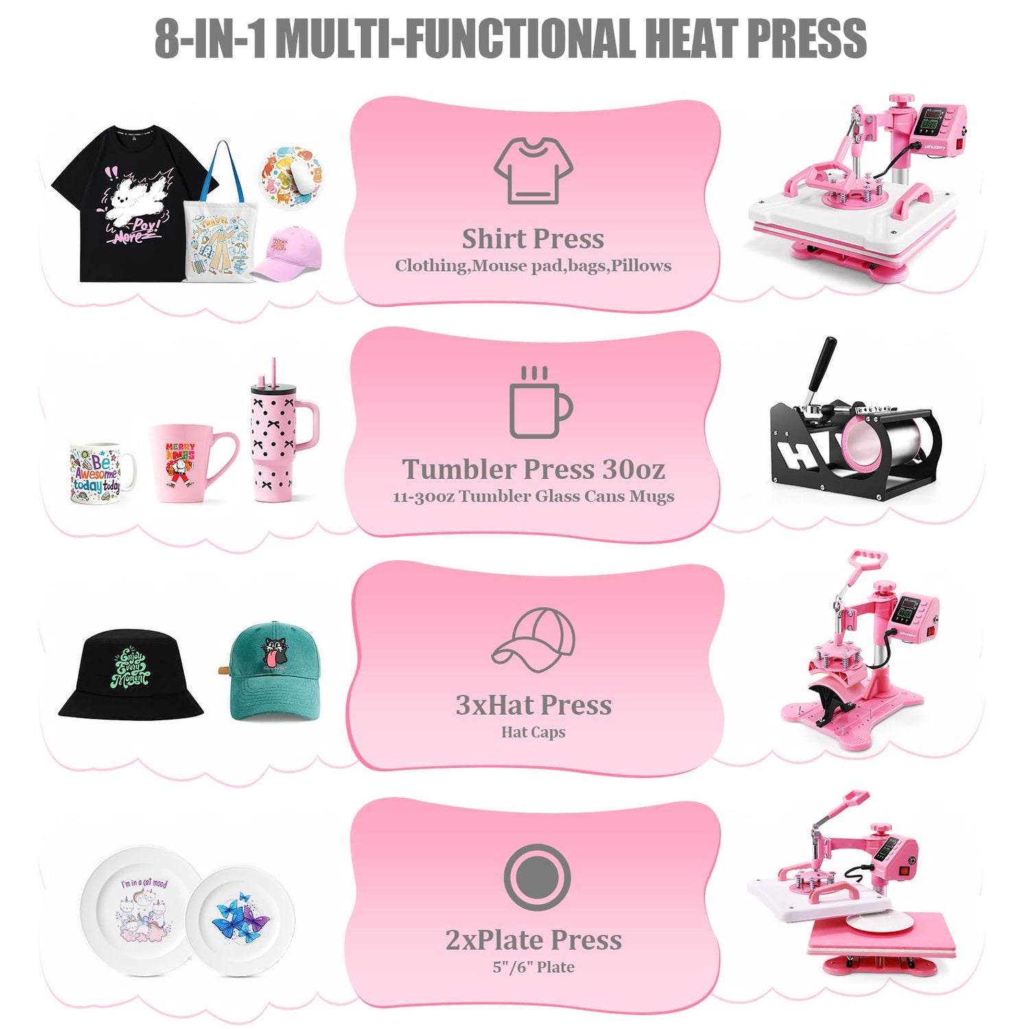 • Multifunctional Swing Away Heat Press in Pink: Transform your craft room or small business with this stylish pink 5 in 1 heat press machine. Featuring a convenient swing away design for safe and easy access, this heat press with attachments includes options for hats, plates, mugs, and more. It's the perfect compact yet powerful solution for home use or small-scale production.