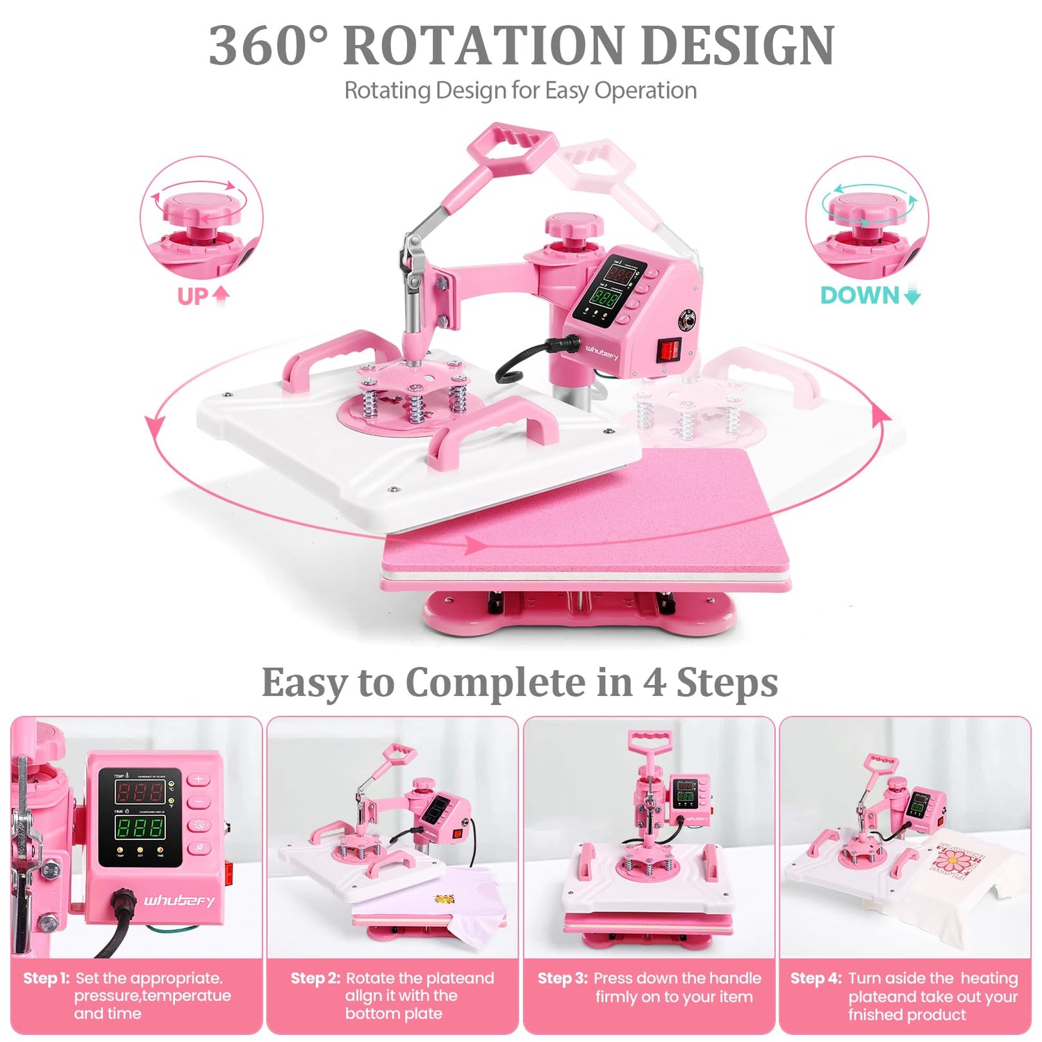 Whubefy Heat Press 12x15, 5 in 1 Heat Press Machine 360° Swing Away, Pink Sublimation Heat Press Digital Heat Transfer with 11oz Tumbler Press Machine, Heat Press Machine for Hat Cap Mug Plate