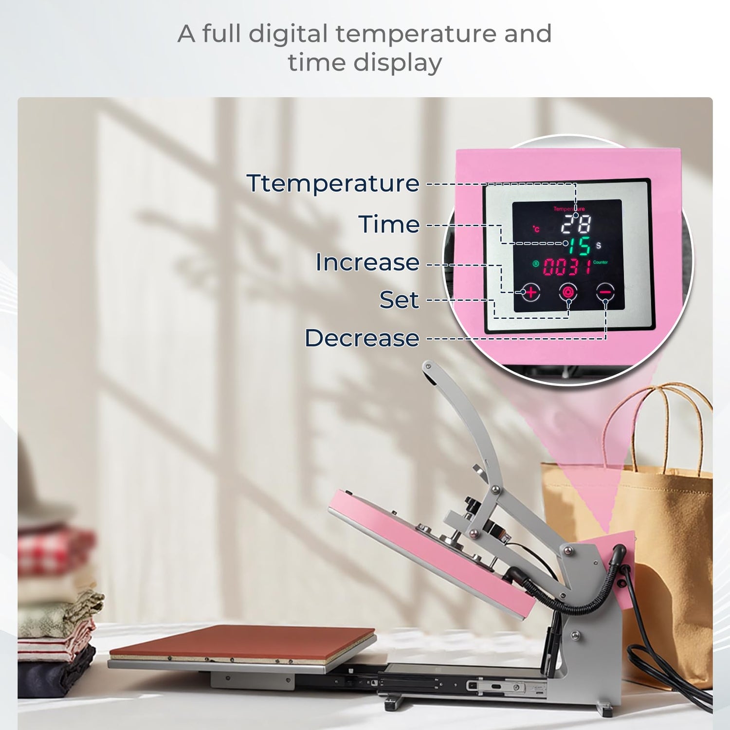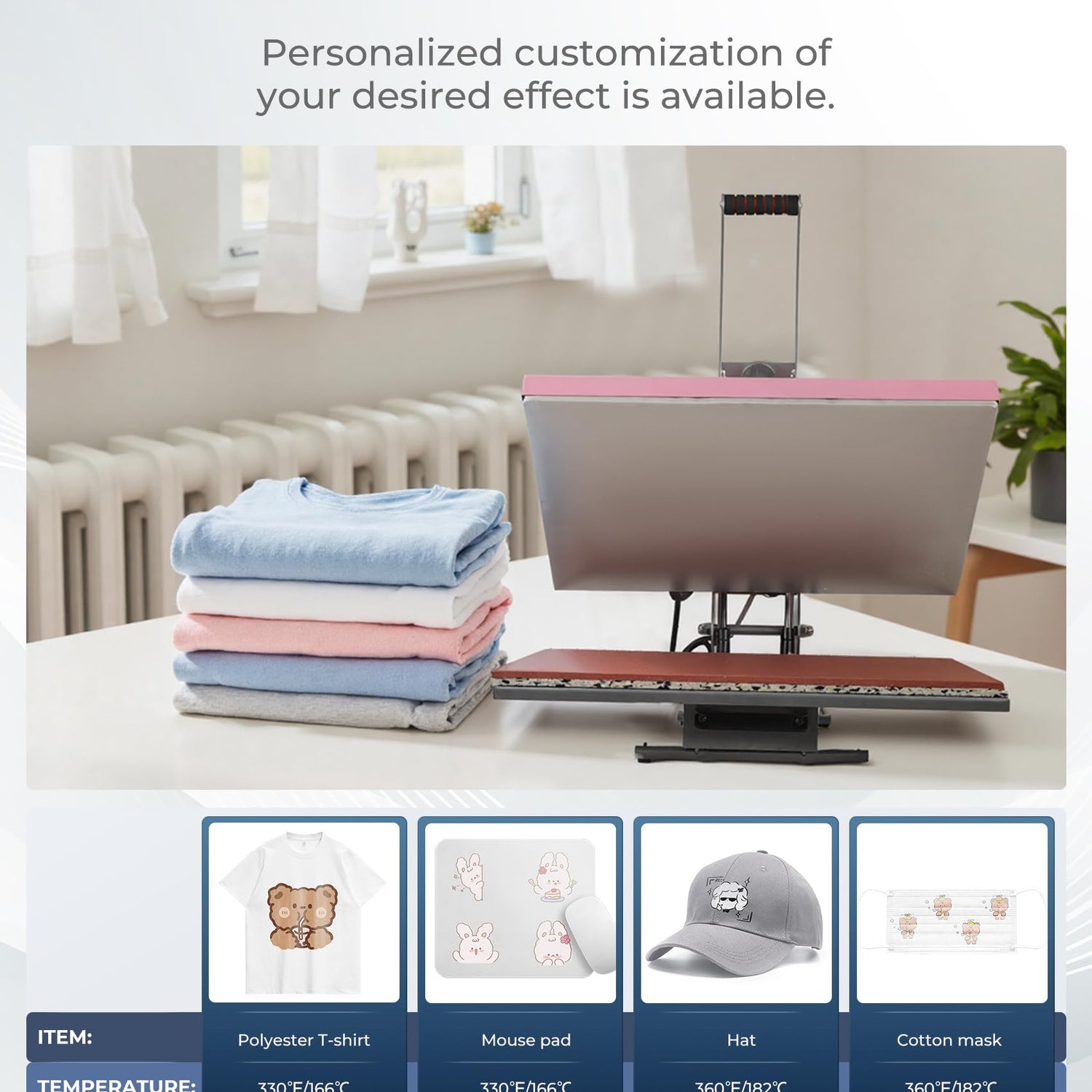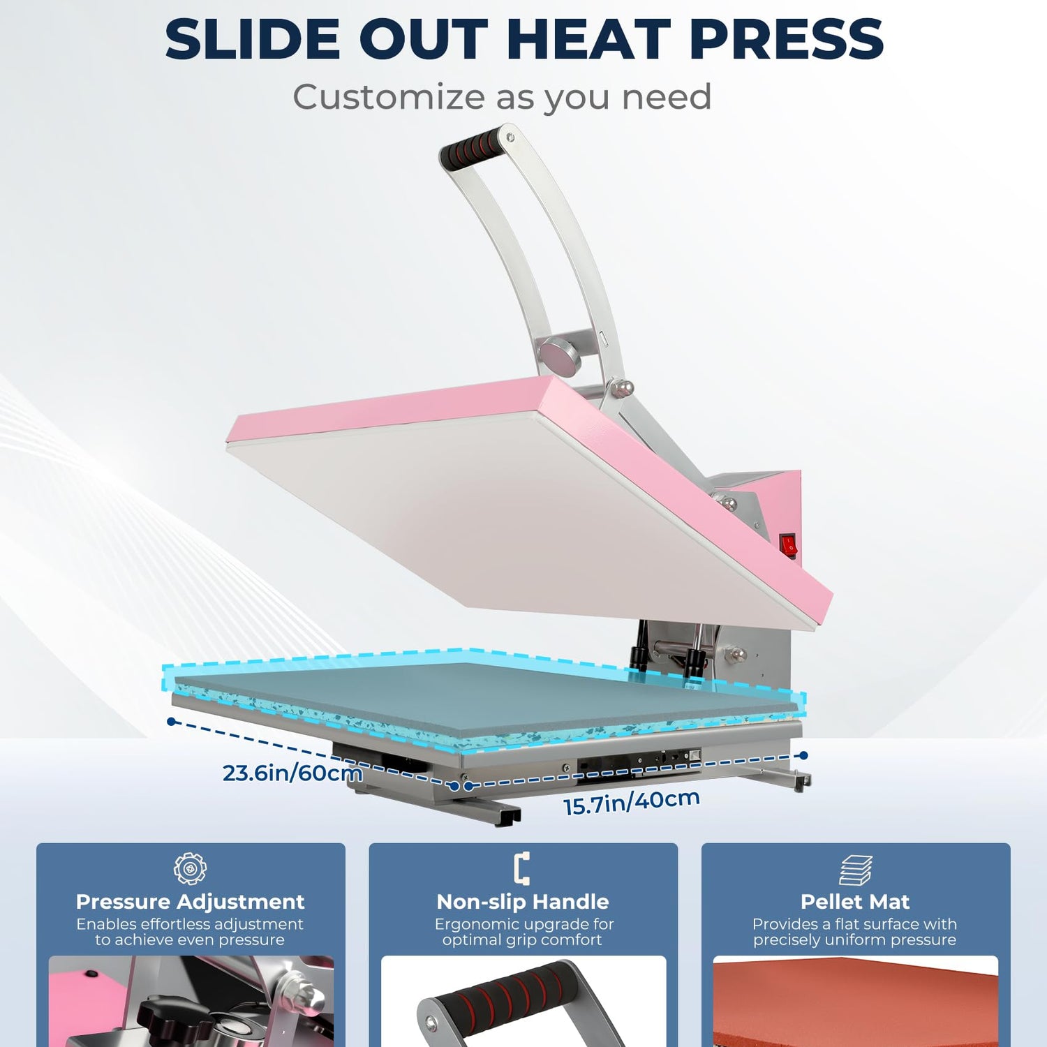 - đ§˘ăSlide-Out Worktableă This semi-automatic heat press machine is fitted with a three-fold slide-out rail and a large 40*60CM steel plate worktable. The slide-out operation is smooth and stable, making it easy to place or remove processed items of different sizes. The ample operating space is suitable for heat transfer needs of various materials such as T-shirts, ceramics, and cushions, ensuring flexible use.