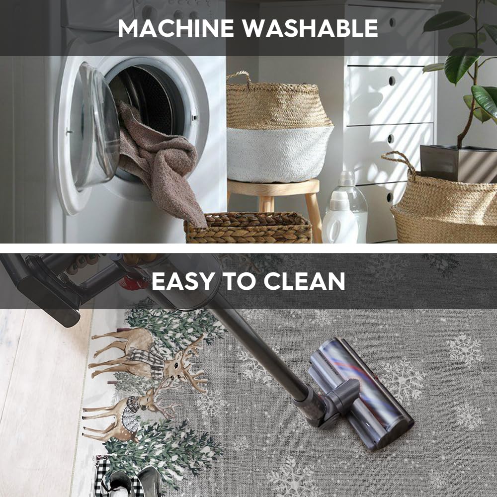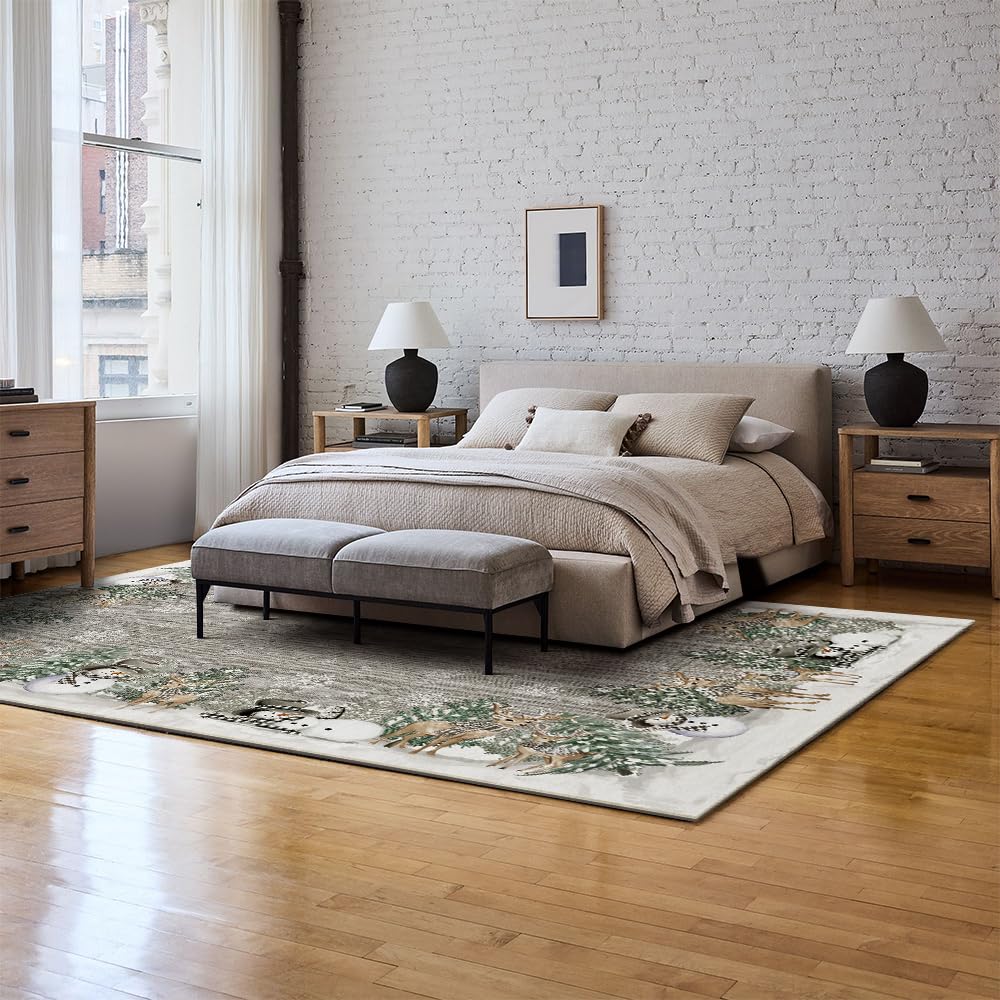 Artoid Mode Grey Snowman Deer Tree Christmas Area Rug, Winter Home Decor Low-Profile Washable Area Rugs for Entryway Bedroom Living Room Laundry Room Indoor 5x7 Feet