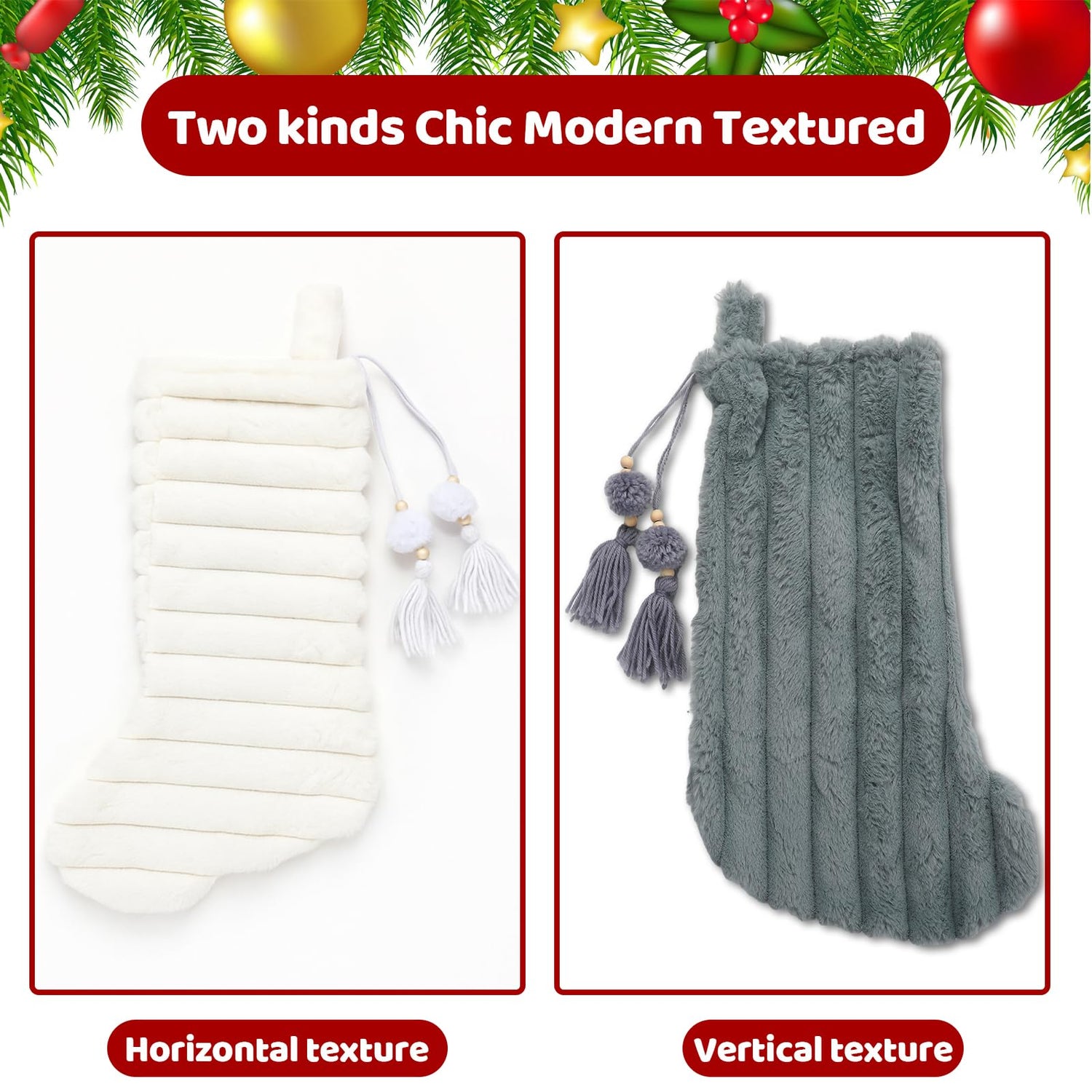• Christmas Stocking Set: this 4 piece Christmas stocking set features elegant white and gray designs, suitable for adding holiday charm to your home; The striped plush faux fur stockings create a luxurious Christmas atmosphere while offering ample space for gifts and treats for the whole family
