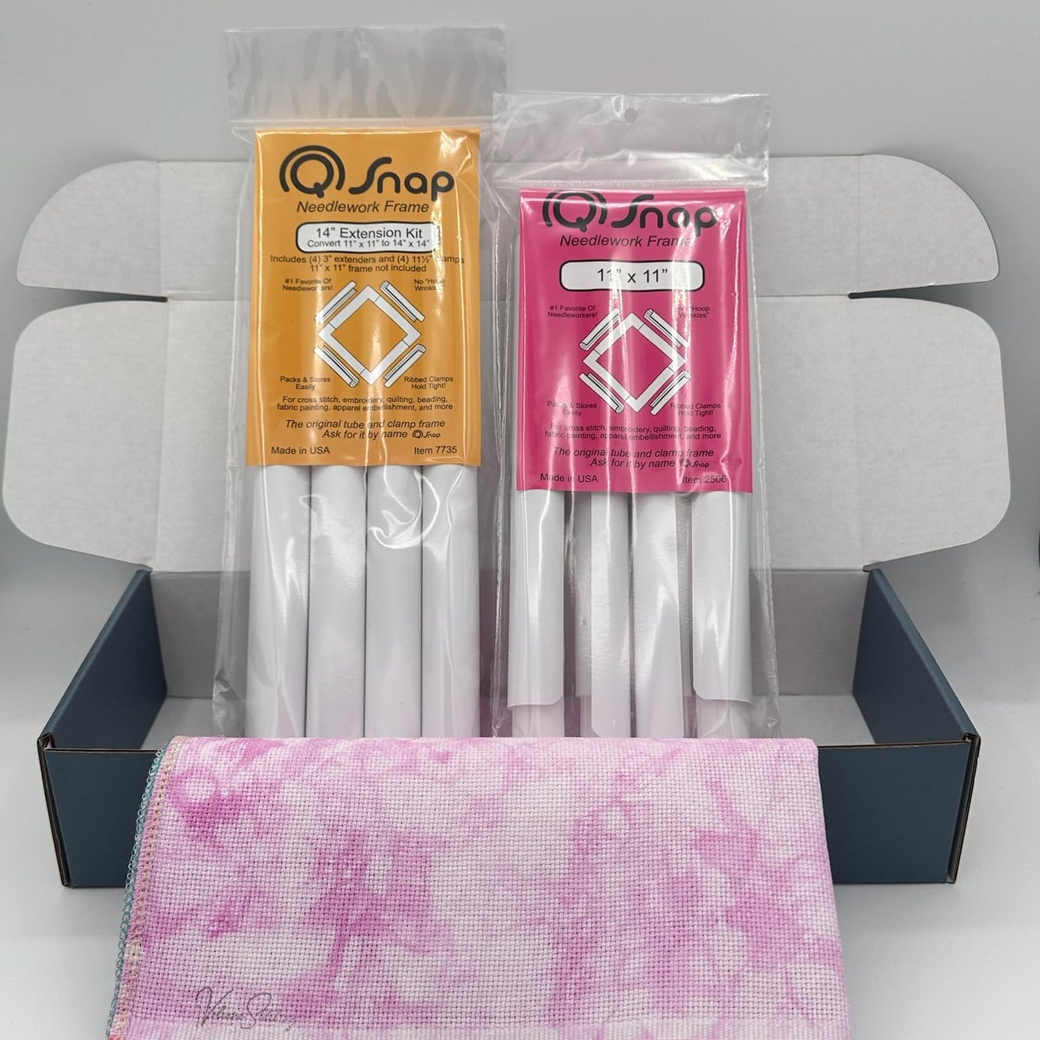 - This bundle includes: 11x11 inch Q Snap frame and 14 inch extension kit by Yarn Tree and 18x21 in. Zweigart Aida 16 count hand-dyed fabric by VolcanoStitching making it easy to start your next project