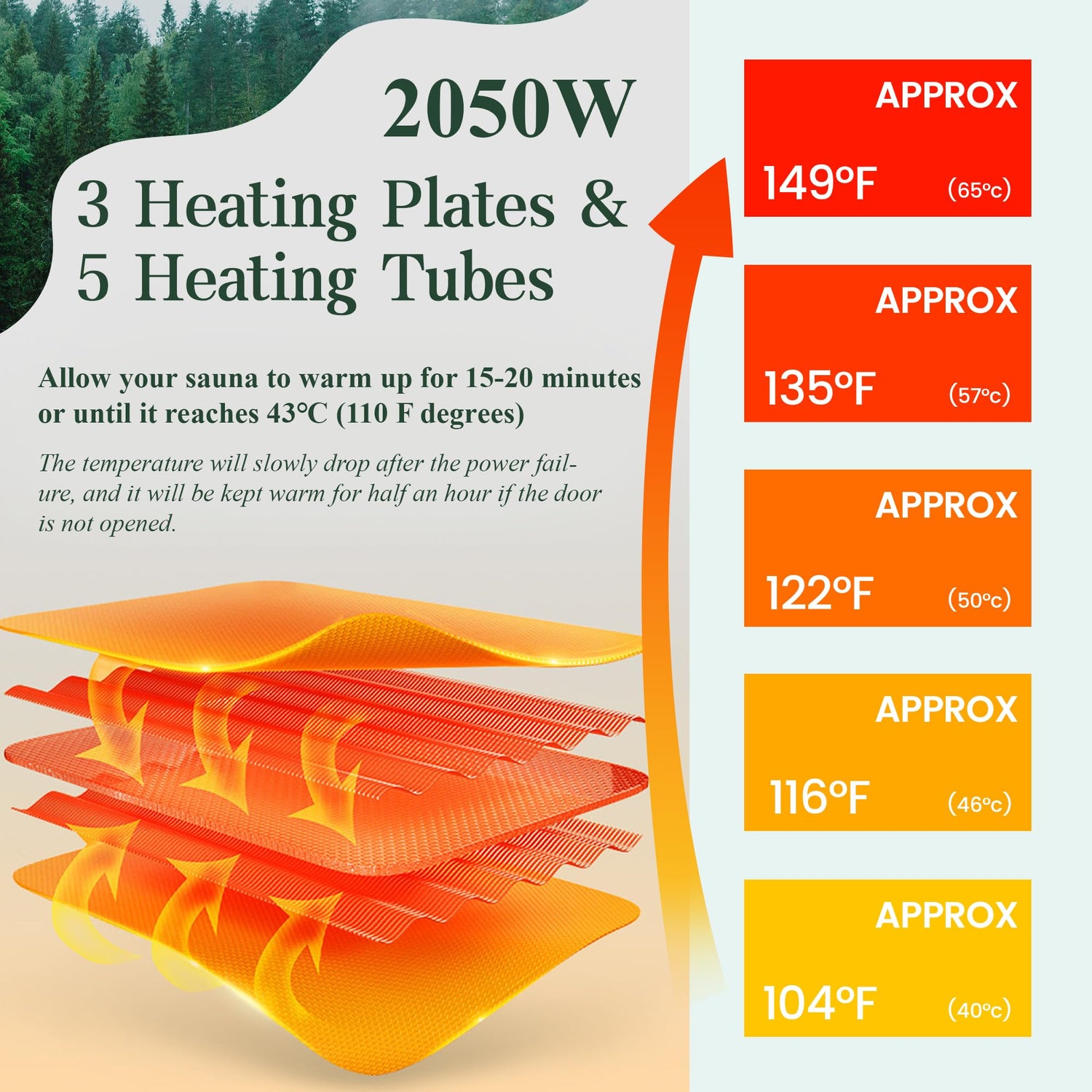 - Enhanced Enjoyment:Our home sauna features Bluetooth connectivity for music playback and a premium sound system for relaxation. The 7-color chromotherapy lighting creates an immersive ambiance, elevating your overall experience