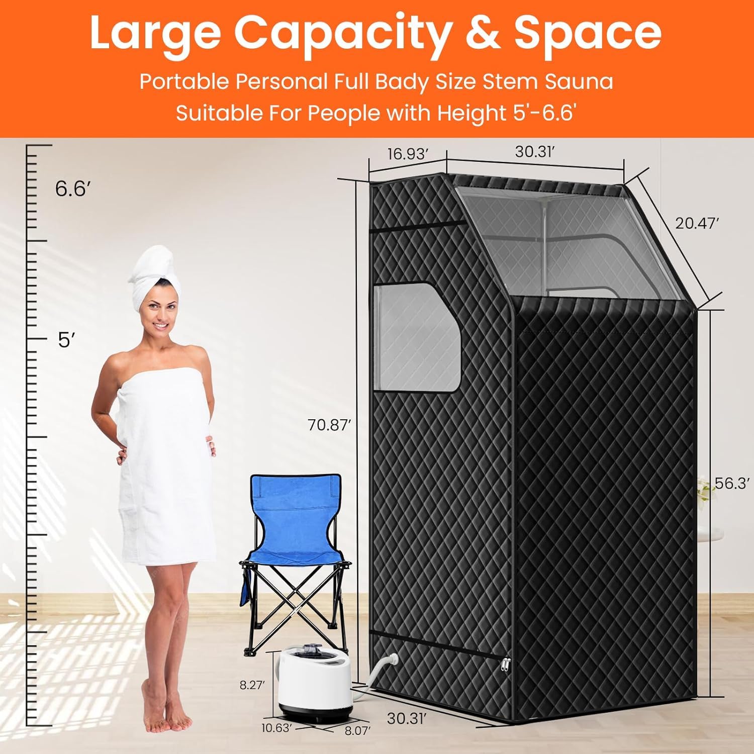 - Large Portable Sauna Box: Small and Dark? NO! The overall size is 2.6'x 2.6'x 5.9', the oversized sauna box is designed with a large tilting clear window to broaden the perspective and 2 side windows for easy communication and ventilation with the outside, comes with a folding sauna chair, allowing you to enjoy sauna time in comfort both standing & sitting