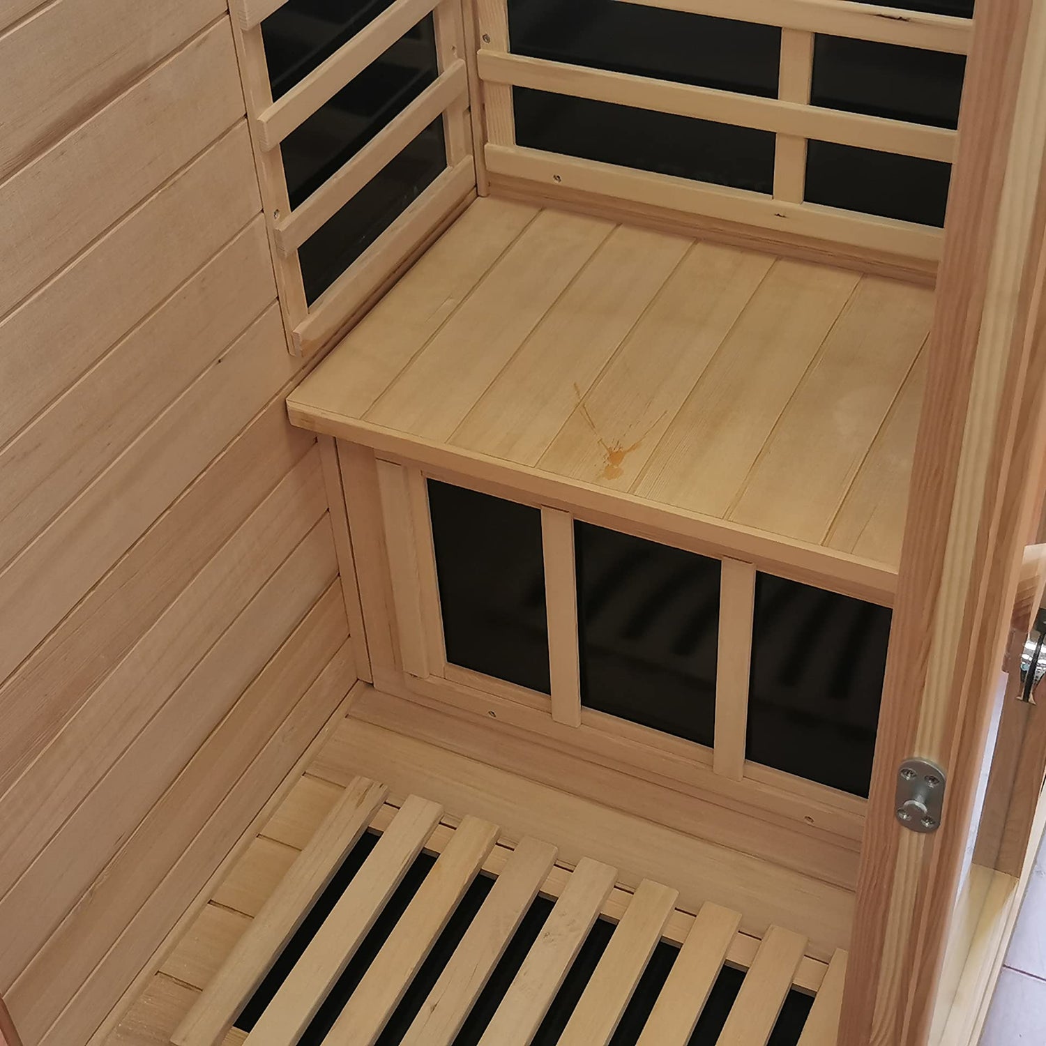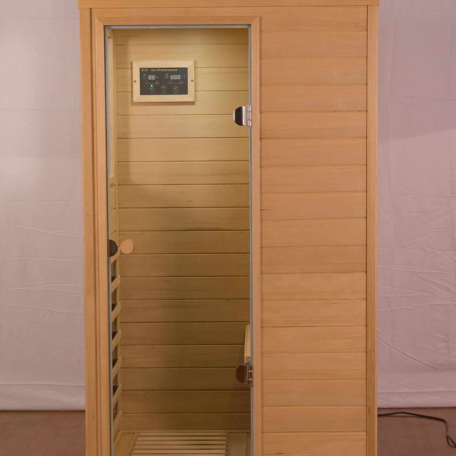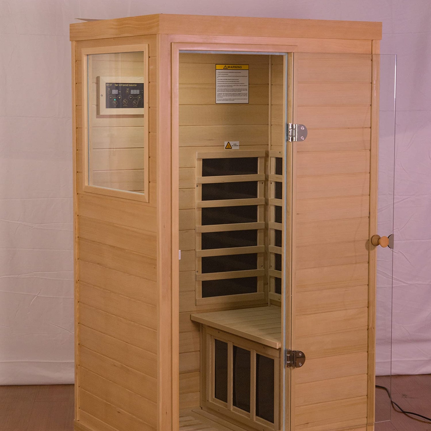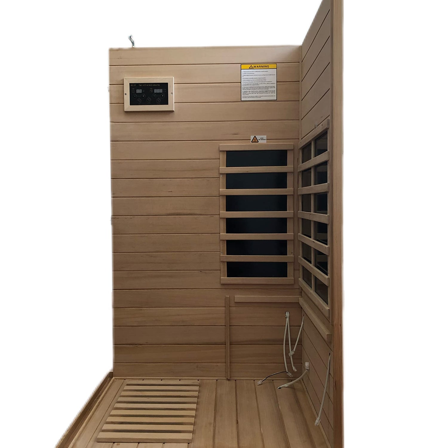 Details: Hemlock Mini one person far infrared door on the left of the indoor sauna room