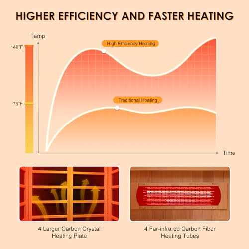 - FAST HEATING IN 15 MINUTES:The iDOTODO Infrared Saunas for home features an equippment of 5 newly upgraded Far Infrared Carbon Crystal Heating Plates and 2 Fast Heating Carbon Fiber Infrared Heating Tubes that allow you to experience a rapid heat up. This powerful combination ensures a constant, rapid heating process, allowing the sauna to reach your desired temperature in just 15 minutes in summer and 25-30 minutes in winter