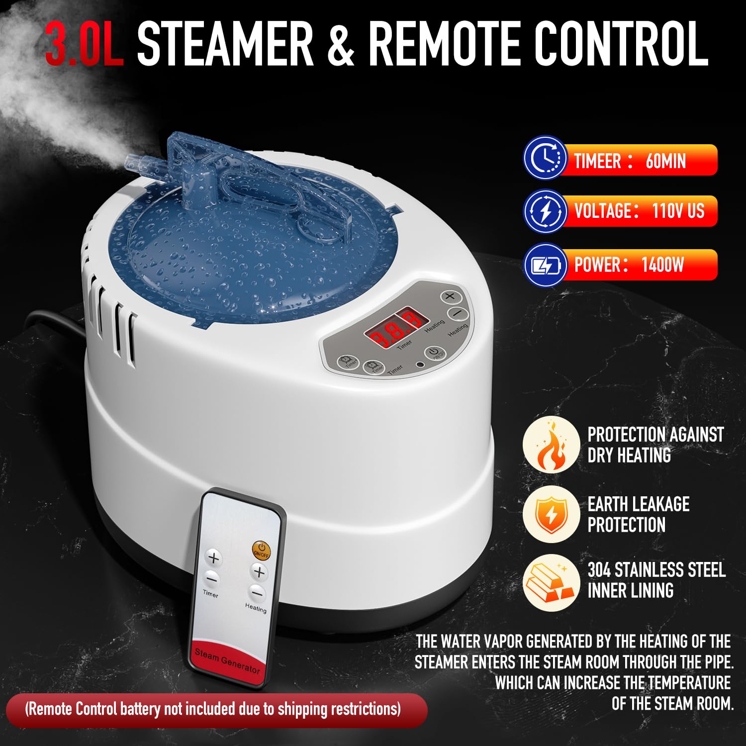 • Large Capacity & Power Steamer Generator - With a 3.0L steam pot(full of water) and 9 temperature settings, this portable home sauna boasts a quick heat-up time of just 6-10 minutes, reaching a maximum temperature of 130°F(affected by the environment). Its 360°omni-directional steam nozzle, powered by a 1400W steam engine, efficiently fills the entire steam tent for a faster and better sauna experience.(Remote Control battery not included due to shipping restrictions)