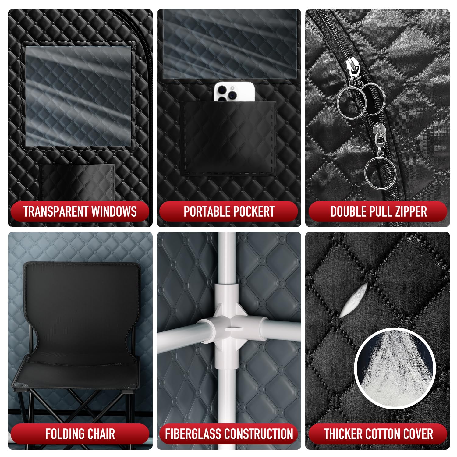 • Affordability Meets Quality - Our superior triple-layer waterproofed cotton along with our new & improved Red Light Therapy Sauna + steamer gives you the lowest operating cost with maximum efficiency. Includes remote (Remote Control battery not included due to shipping restrictions), foldable chair and tent design allows for an easy-to-maintain sauna. Whether at home or on the move, ISIDO THERAPY brings calm without the cost, a solution for those mindful of today's energy challenges.