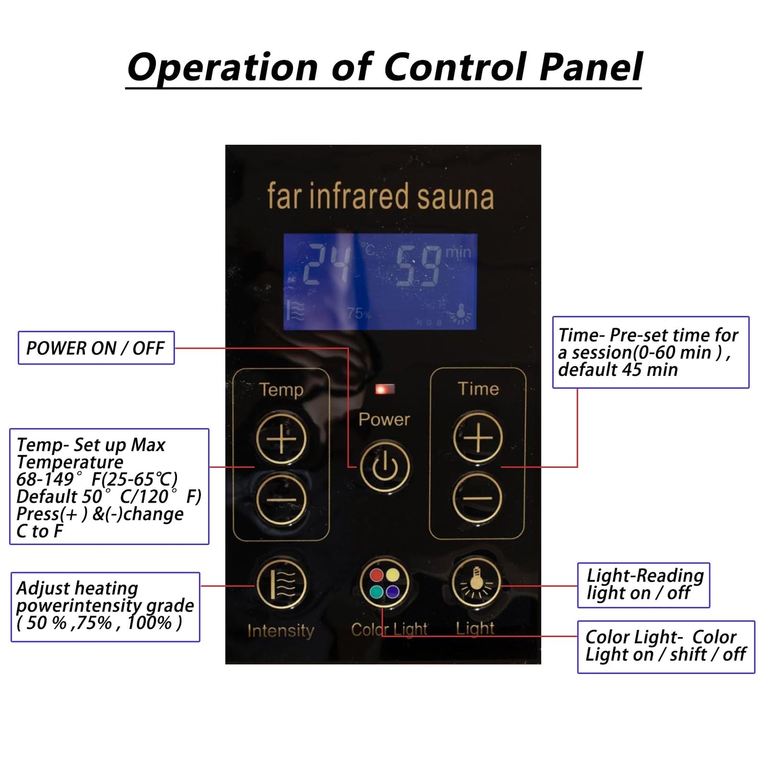 - ✅Far Infrared Sauna - Built-in 8 Carbon Crystal Far Infrared Low EMF Heating Plates, 2050W Power, Max Temperature Up to 65°C/149°F, Light Touch Control Panel and LED Display, Easy to use; Bluetooth speaker and LED reading light.