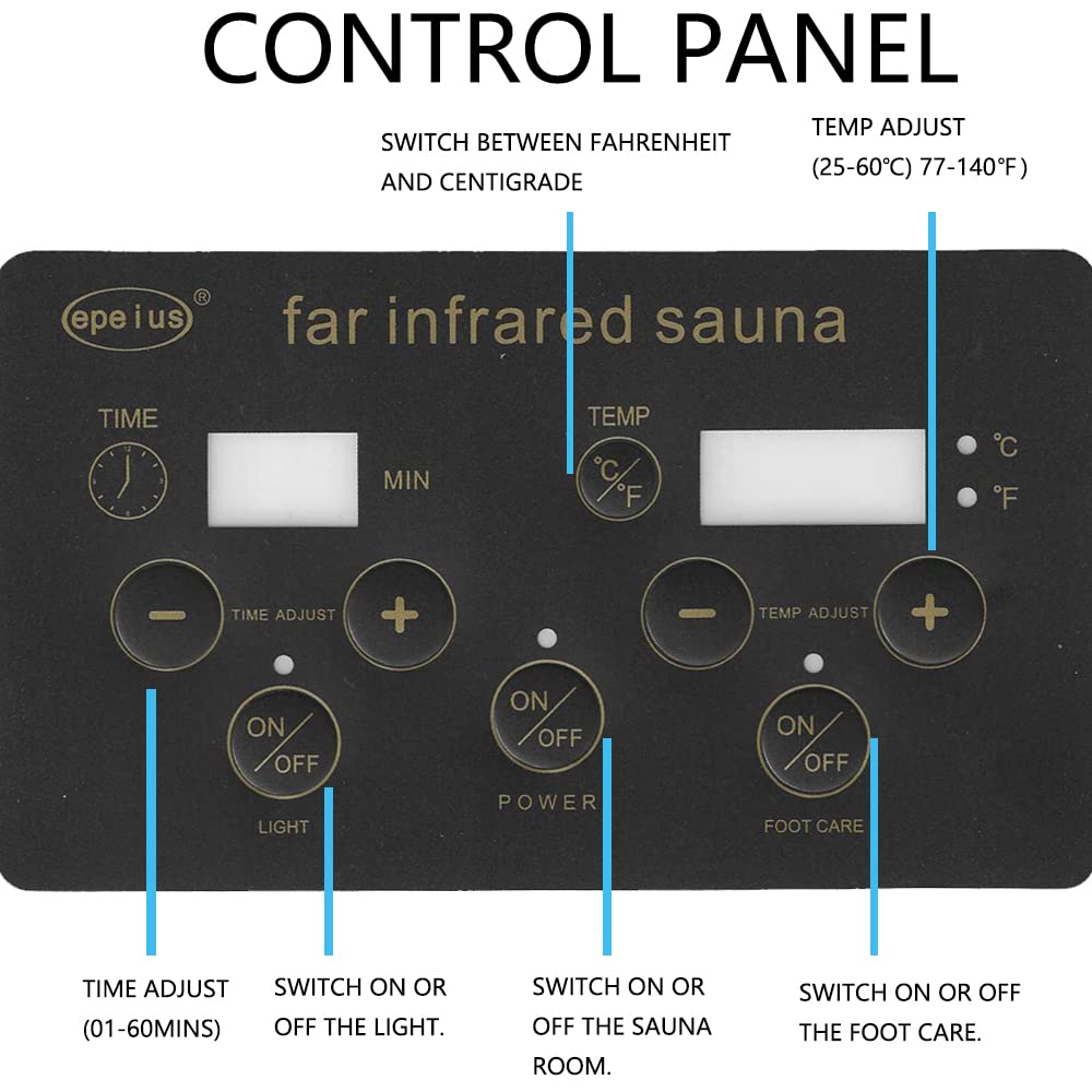 - Low EMF Far Infrared Sauna: Home sauna - non-radiation carbon crystal far-infrared heating plates, 1500 W, stable wave band, 100% maintained in the low EMF range for human health. 15 minutes quick preheat (Not maximum temperature), temperature control range: 77-149 degrees Fahrenheit (25-65 degrees Celsius). Each sauna heater is perfectly positioned to provide steady heat throughout your body.