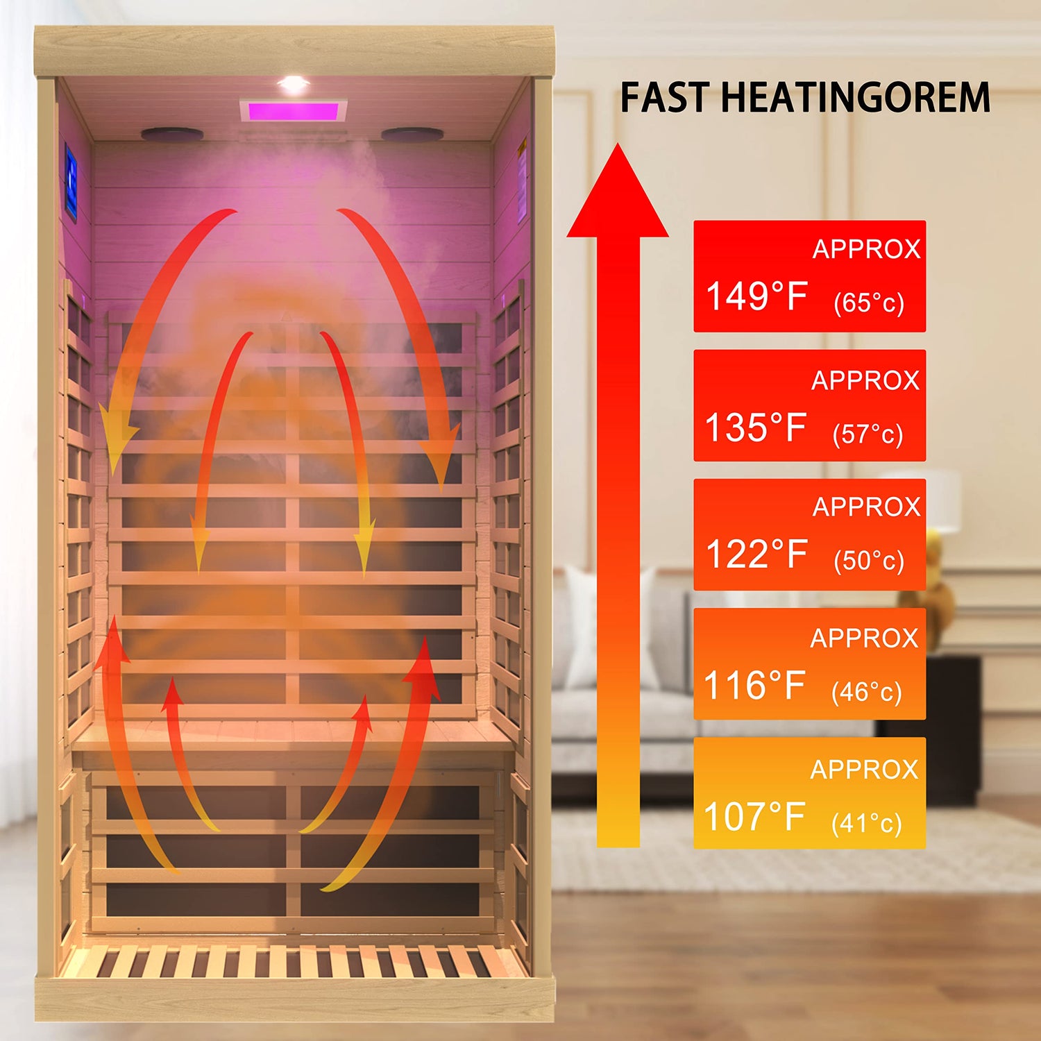 - FAR INFRARED HEATING - Home sauna with built-in carbon crystal adjustable temperature heating panel, 1350W power, 10-15 minutes quick preheat, maximum temperature up to 65°C/149°F, soothes muscle and joint pains, soothes the body by heating up the core temperature, relaxes the muscles, relieves joint pains, heats up in all directions, provides stable heat for the whole body.