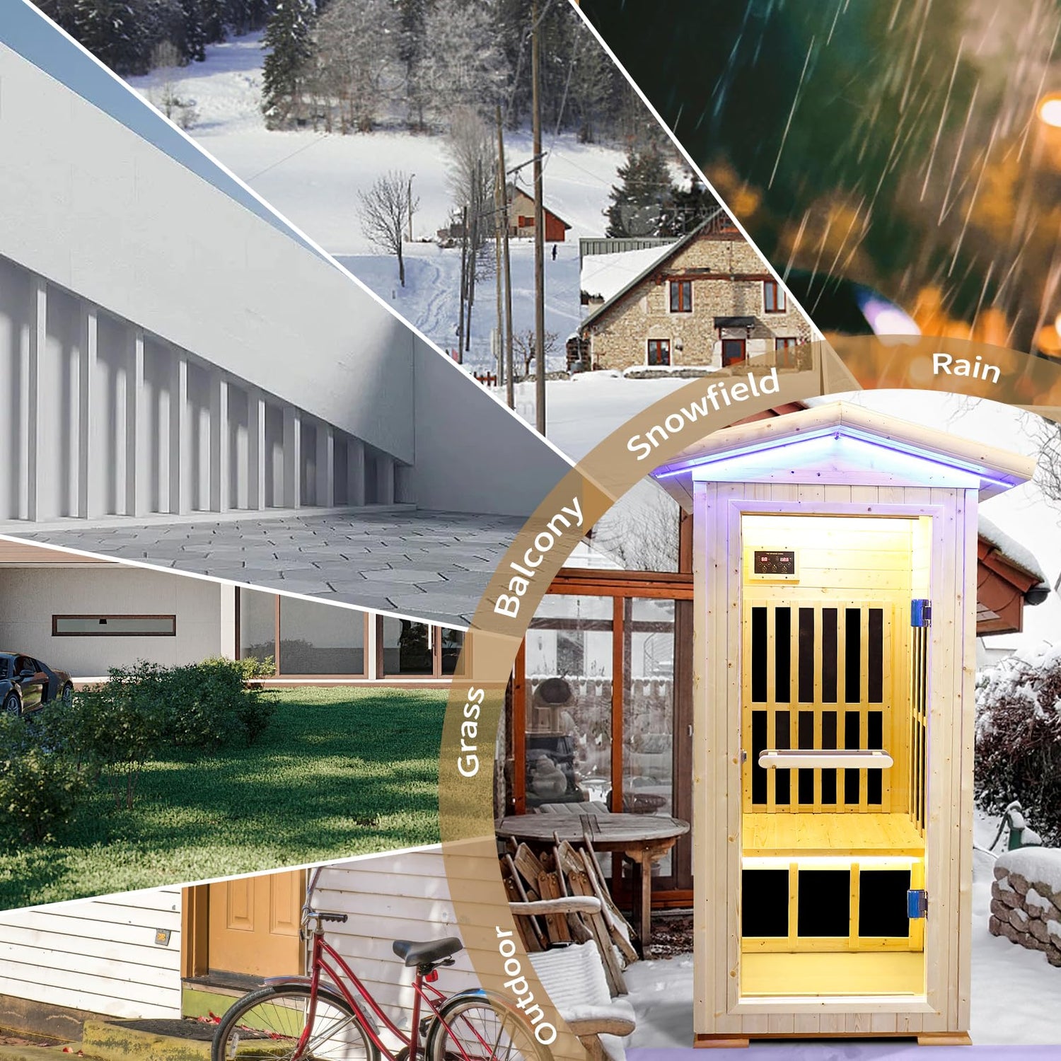 - MADE OF HIGH-QUALITY RECYCLABLE MATERIALS: This infrared sauna room measuring 35.4 * 35.4 * 81.1inch offers for 1 person and is made of Outdoor Spruce Wood.Our sauna outdoor can be heated up quickly and its maximum temperature can be set to 60°C.This home sauna is perfect for sauna at home sessions, offering a compact yet effective solution.