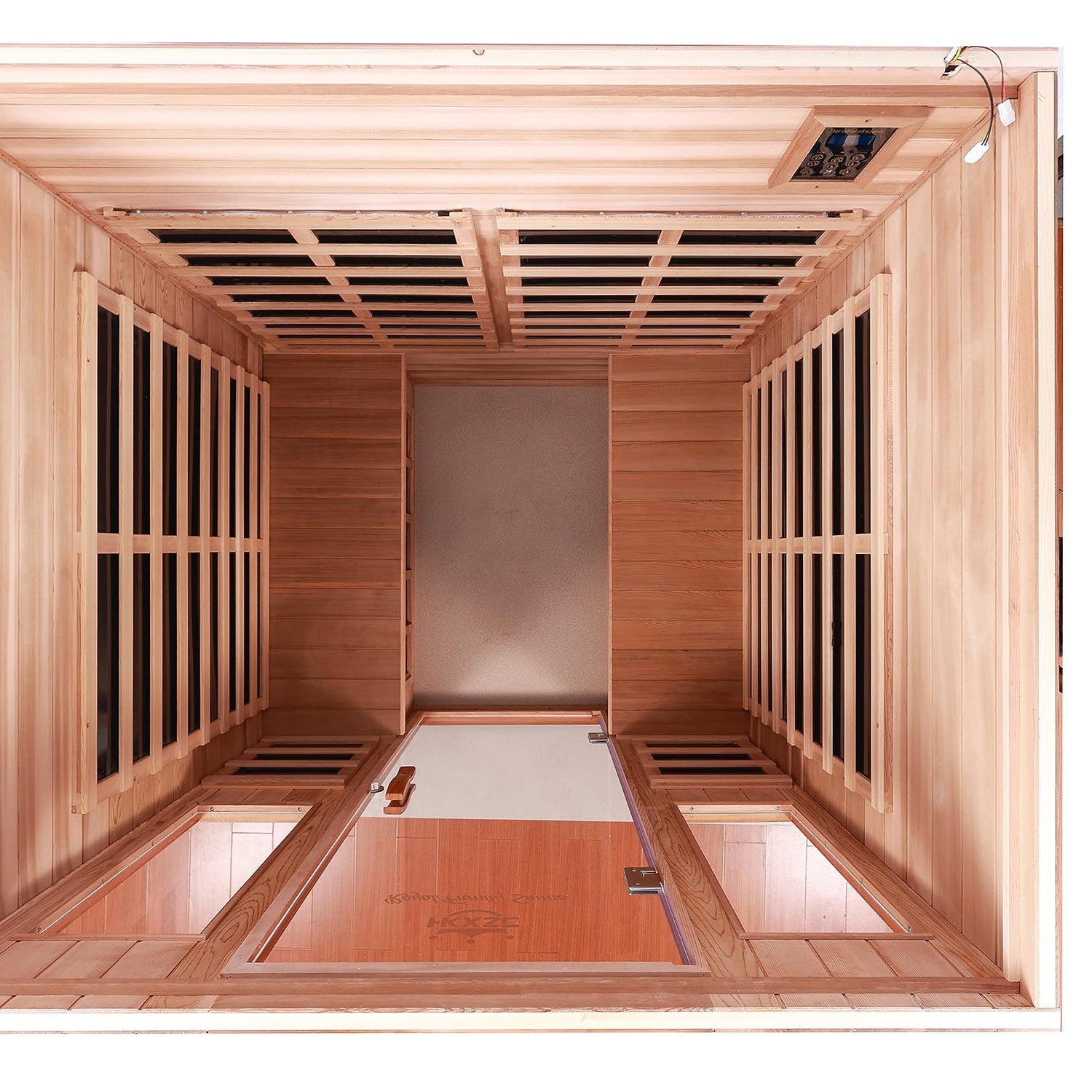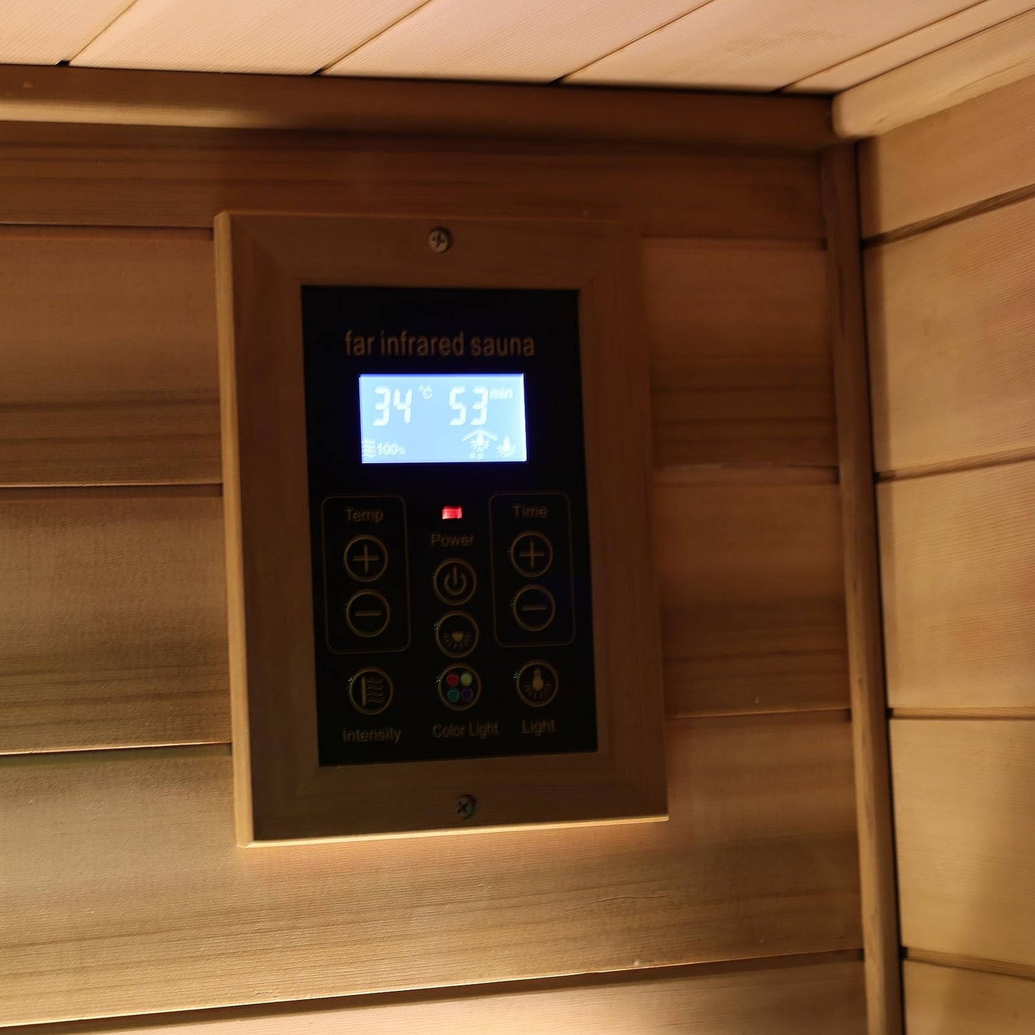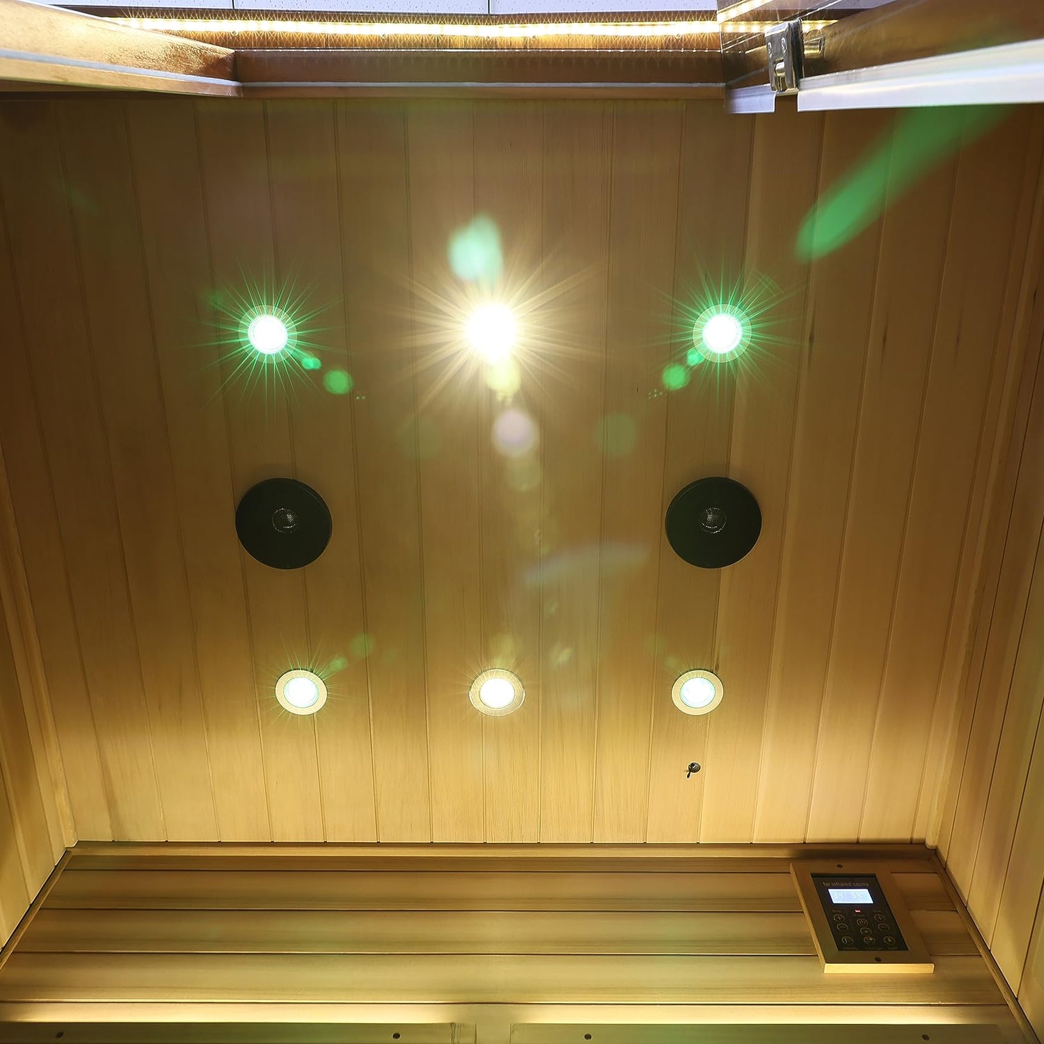 Outdoor Sauna for 4 Person,Applicable Indoors and Outdoors. Far Infrared Sauna 8 Low EMF Heaters, Wooden Sauna Room 2050 Watt, Mahogany Wood, Chromotherapy, Bluetooth Speaker, LCD, LED.