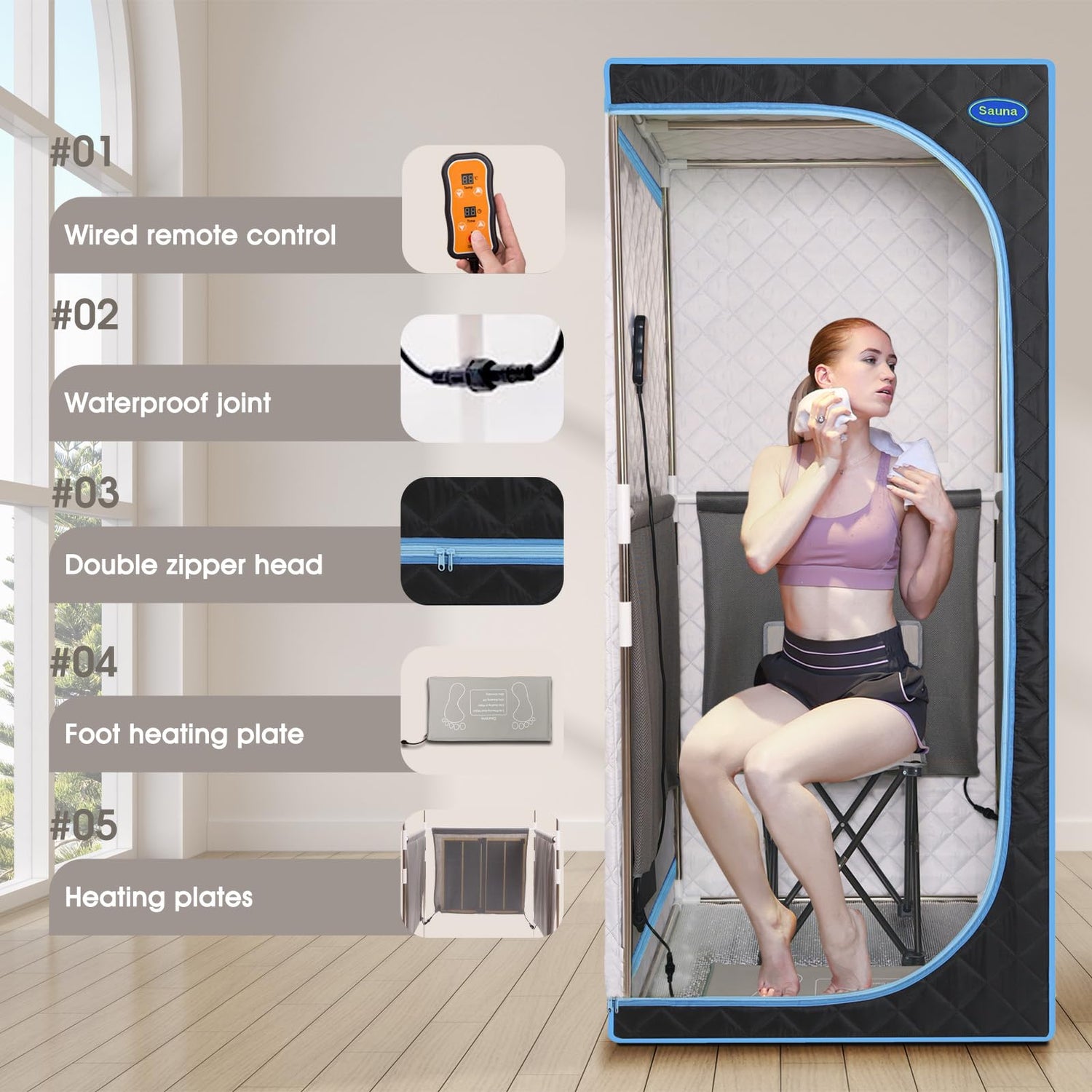 • PORTABLE SAUNA - Full size portable sauna :31.5*31.5*68.9 inches, with a detachable frame for easy folding and storage. The portable sauna includes heated foot MATS, folding chairs and wired remote controls. Help you enjoy the sauna experience at home.