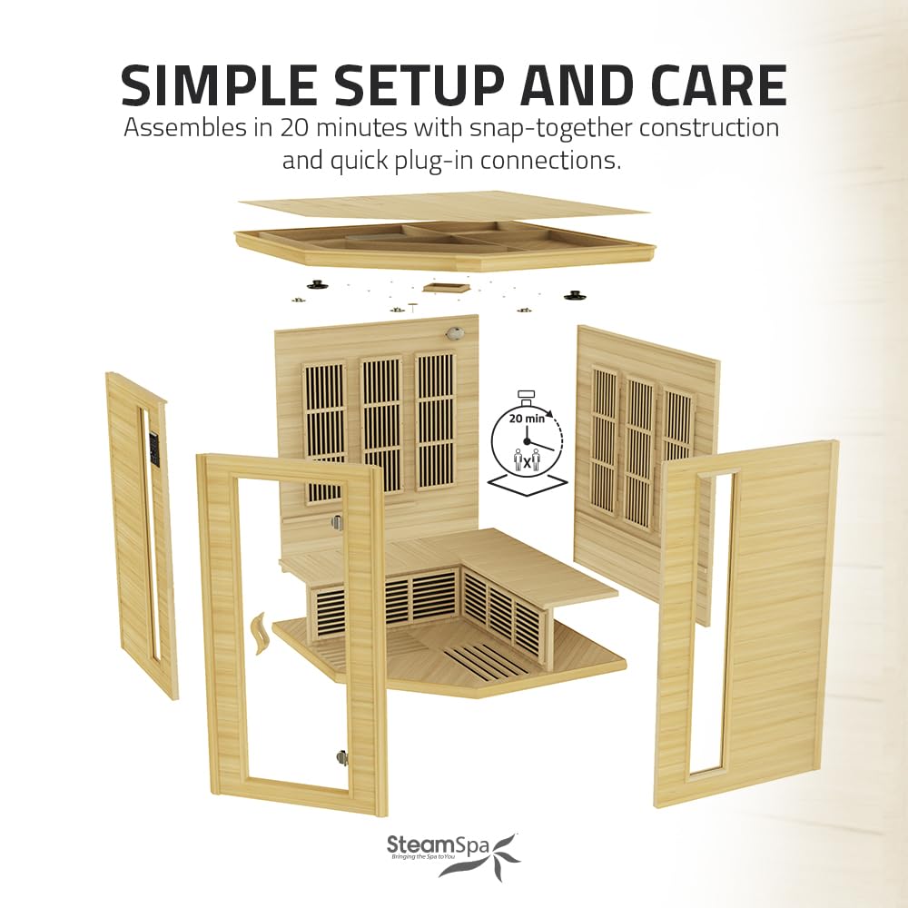 SteamSpa 1-5 Person Low EMF Carbon FAR Infrared Hemlock Wood and Tempered Glass Indoor Home Sauna Room with LED Touch Control Panel, Color LED Therapy Light, Bluetooth Speaker, Oxygen