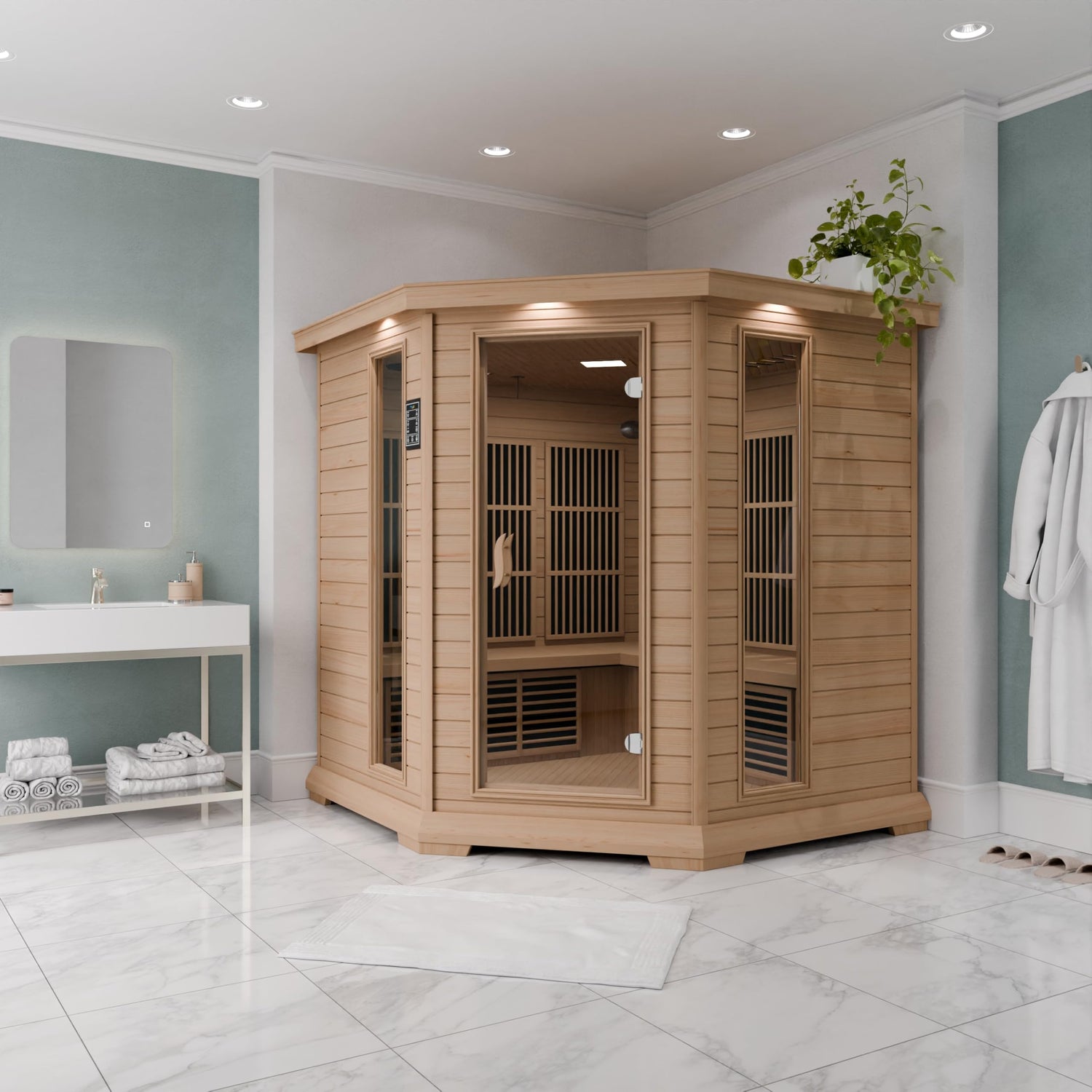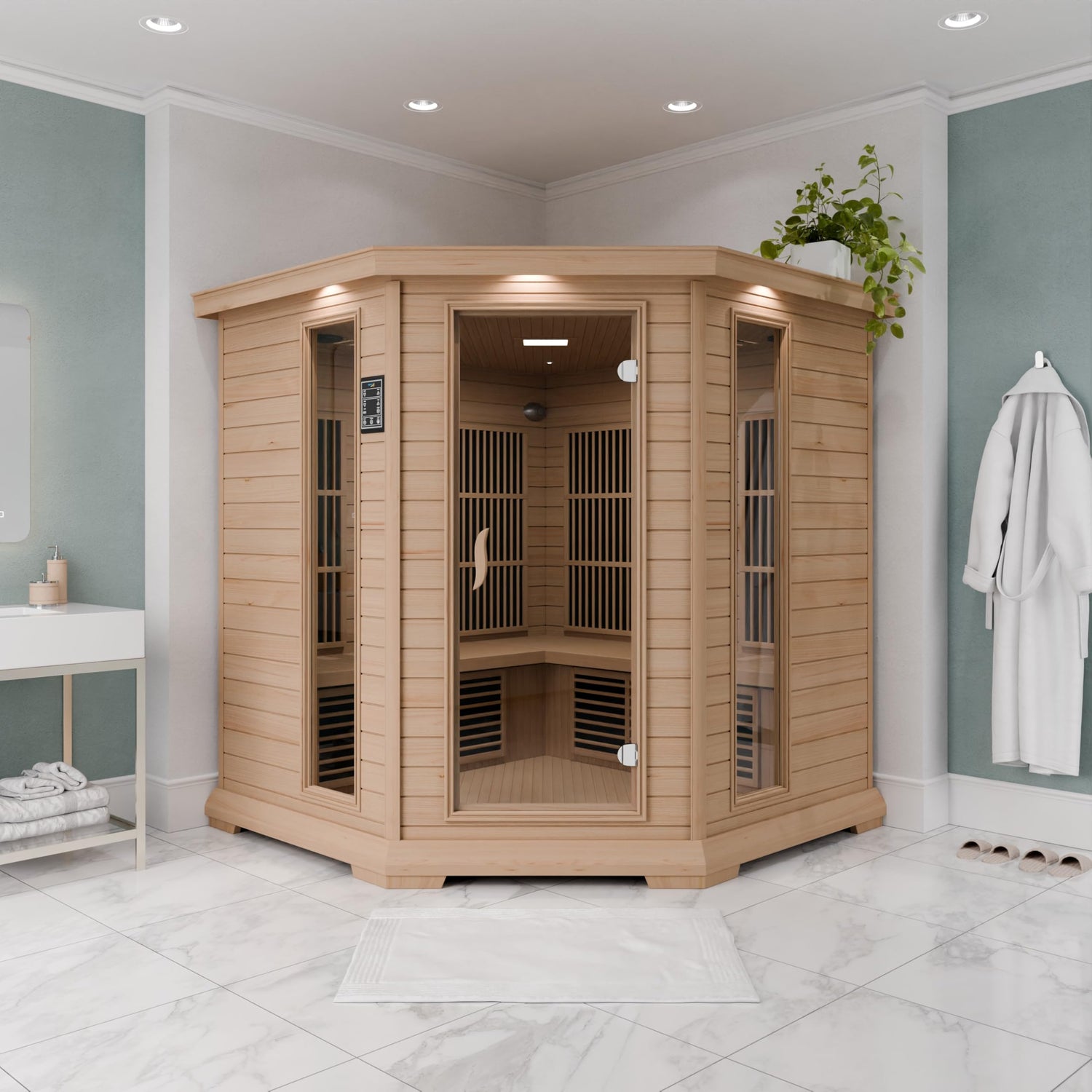 - CRAFTED FROM PREMIUM NATURAL WOOD & TEMPERED GLASS: Beautiful hemlock wood construction is renewable and eco-friendly, giving our sauna a charming Old World vibe, while the tempered glass panels prevent heat loss to help promote energy-efficient operation