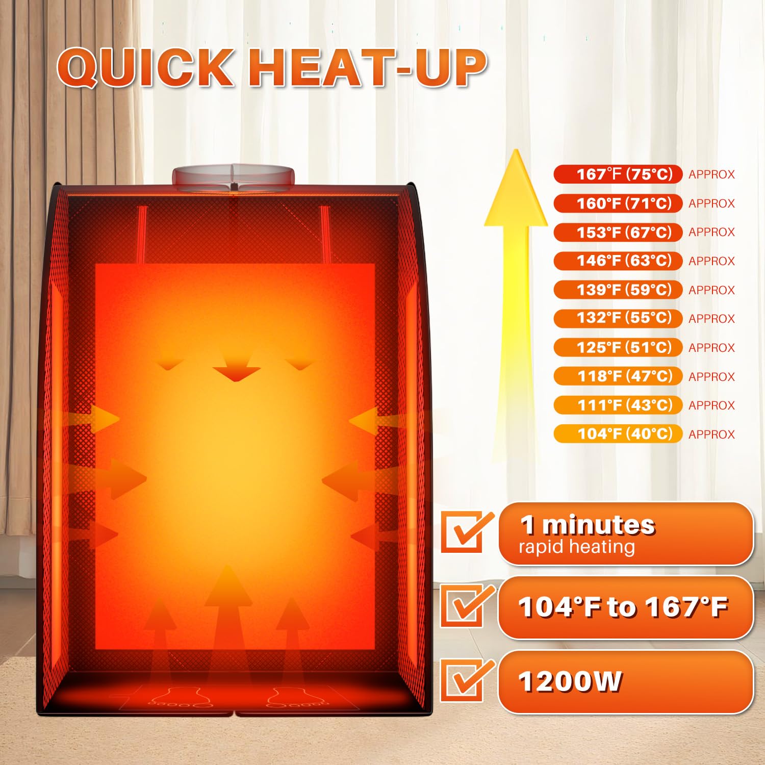 - Heats up in just 1 minute: 1200W high power for rapid heating. Equipped with a remote control, the temperature is adjustable from 104°F to 167°F, and the timer can be set from 10 to 90 minutes to suit your needs. The heated foot pad offers 6 adjustable temperature levels. For effective sauna sessions, sweating is key! It's recommended to use 2-3 times a week and stay hydrated during use