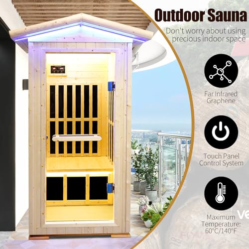 - 【Outdoor Sauna】Built to last, the sauna uses insulated wood and safety-tempered glass. Colorful exterior LED light strips create a radiant ambiance around your yard or pool at night, while the integrated premium sound system lets you enjoy music as you relax.