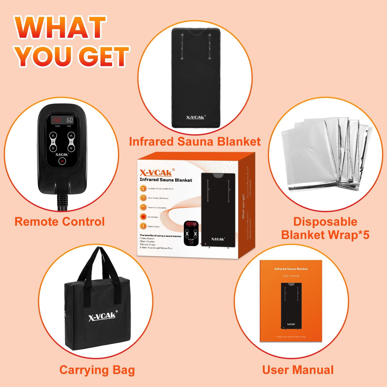 - 【What You Get】Sauna Blanket, Remote Control, 5 Disposable Blanket Wraps, Carrying Bag, Packing Box. X-Vcak sauna blanket is waterproof, leak-proof, and overheat-proof, allowing you to enjoy the sauna with more peace of mind.