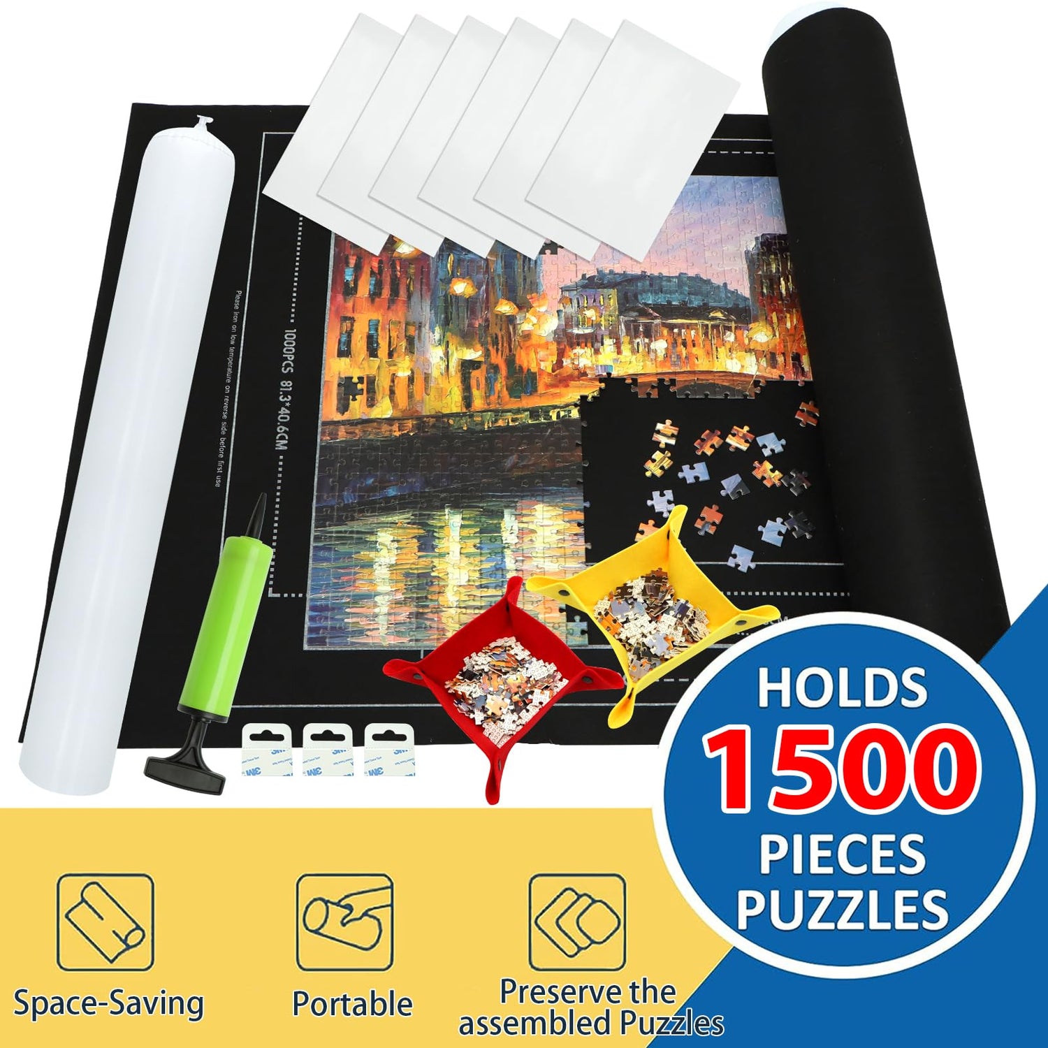 Portable Puzzle Mat Roll Up - with 9 Glue Sheets, Sorting Trays, Hand Pump, Inflatable Tube, and Storage Bag - Perfect for Kids and Adults (Black, 1500pcs)