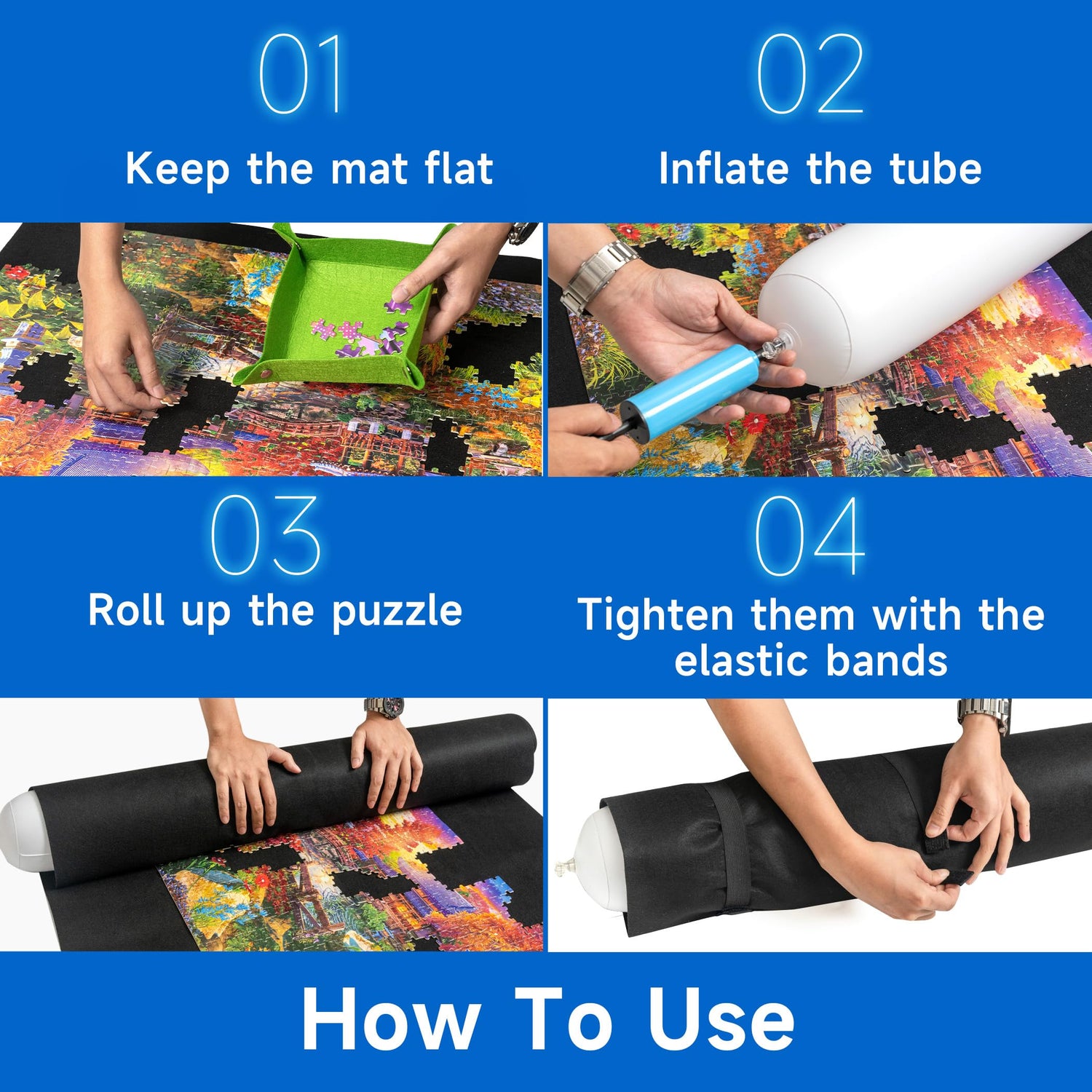 - Easy to Use - Just spread the felt mat on a flat surface, then you can start your puzzle fun. When you want to pause and save the game for the next time, please inflate the tube, place it at one end of the mat, then roll up the mat together with the puzzles with even pressure. Don’t forget to fasten both ends and the middle of the roll with the enclosed elastic bands and secure the roll in the storage bag.