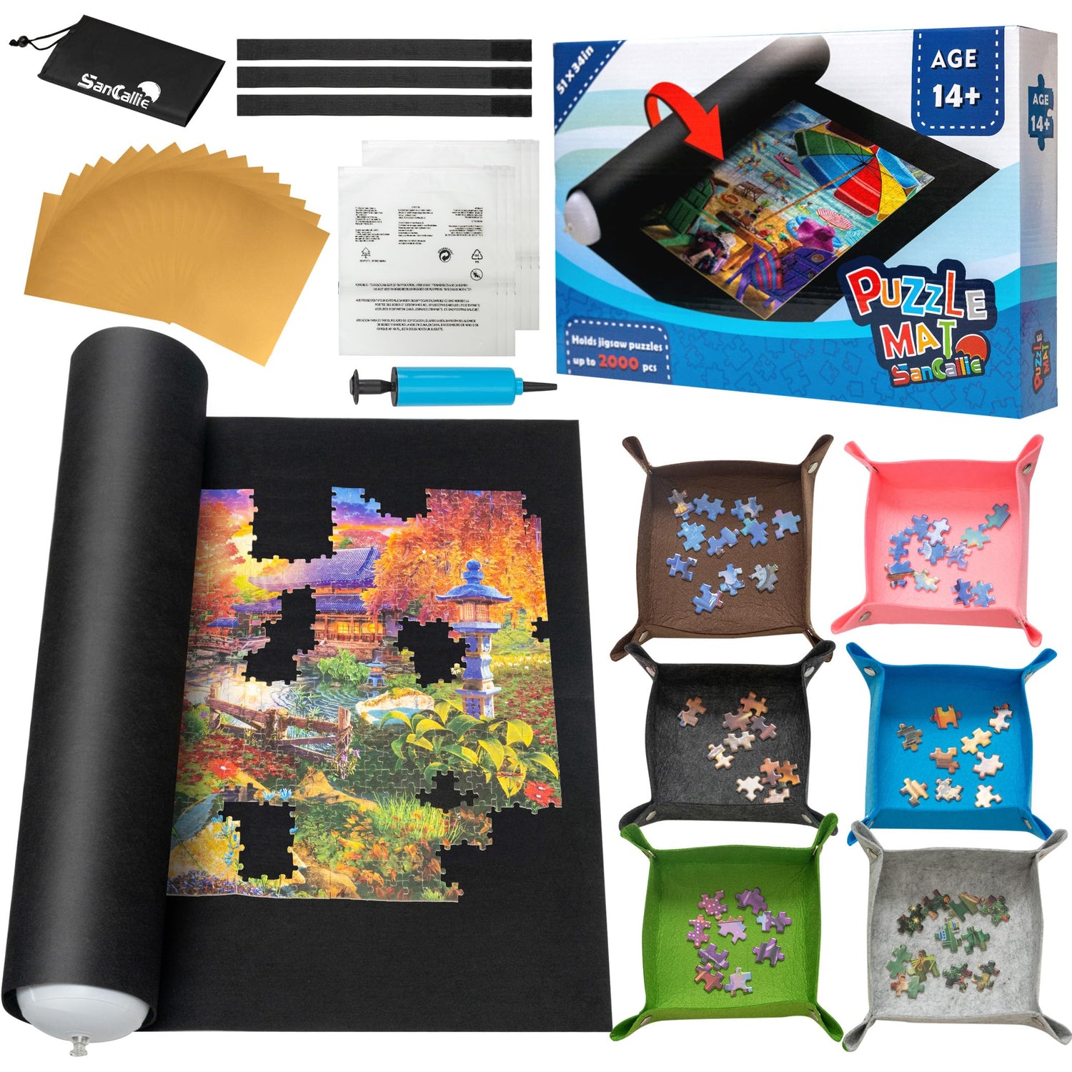 Sancallie 51“x34” Large Jigsaw Puzzle Mat Roll Up Mat- with 15 Glue Sheets, 6 PE Bags Jigroll to 2,000 Pieces with 6 Colorful Trays, Gift Box with Drawstring Bag, 3 Elastic Band, Hand Pump