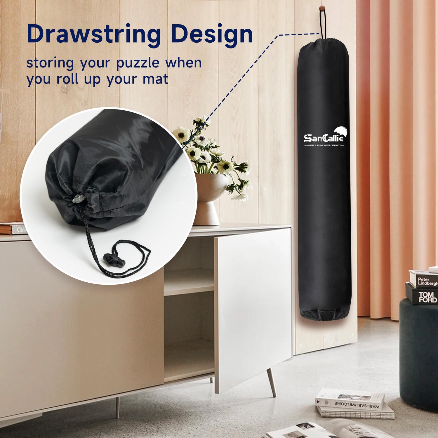 This puzzle mat is processed out of premium felt fabric and packaged in a long box to prevent wrinkles. It is black in color can be easily spread on the floor. An inflatable tube is enclosed for rolling up the mat so that the pieces inside won’t slip or fall, while the 3 elastic bands can provide further security of the roll by keeping the roll stable.