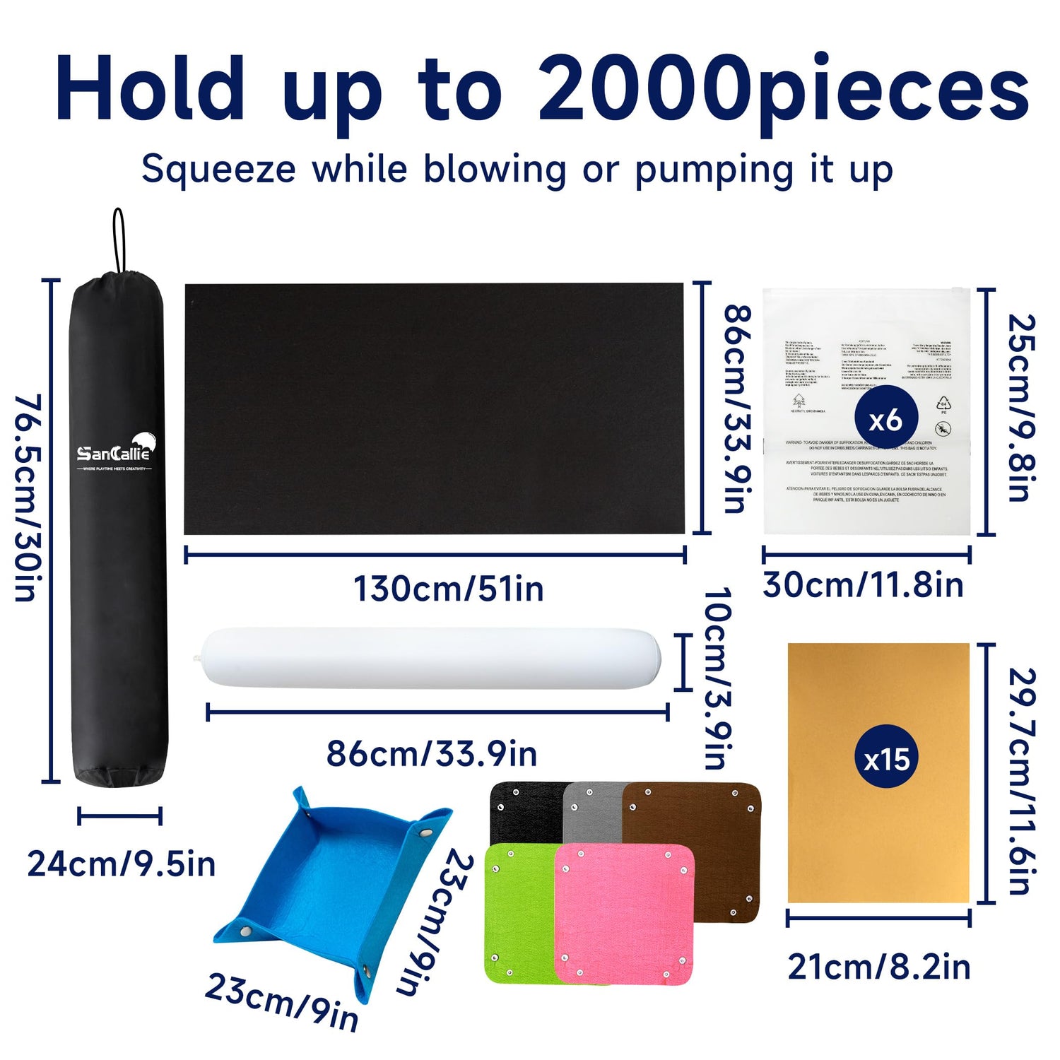 - Inflatable Tube - Ensures perfect storage of your unfinished puzzle game for the next time. To further immobilize puzzle pieces, 2 elastic bands are enclosed to fasten both ends of the rolled up mat. The anti-slip felt mat measures 51 × 33.9 in, holding up to 2, 000 pieces and ensuring every of them stay put with no crease.