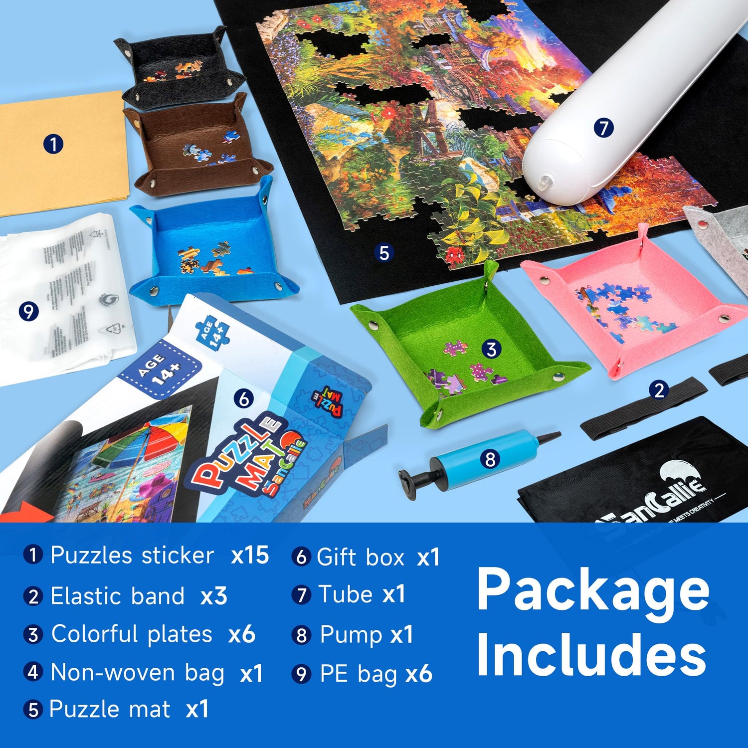 - Package Contents - Felt mat × 1, hand pump × 1, inflatable tube × 1, elastic band × 3, storage bag × 1, colored tray × 6, puzzle sticker × 15, PE bag × 6. Exquisite package box makes it an ideal gift for all ages. Please note that package includes no puzzles
