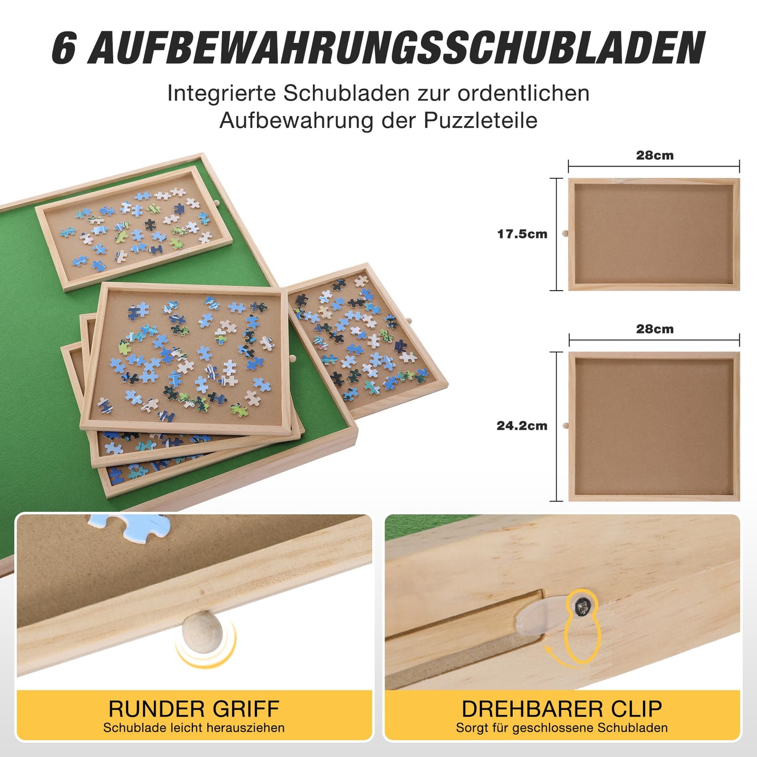 - Tidy Pieces, Happy Puzzling: Keep every piece within reach. FUNTOK puzzle table with drawers features 6 spacious storage units with 12 customizable compartments. Adjust the dividers to sort by color or shape, and twist the lock to secure everything in place
