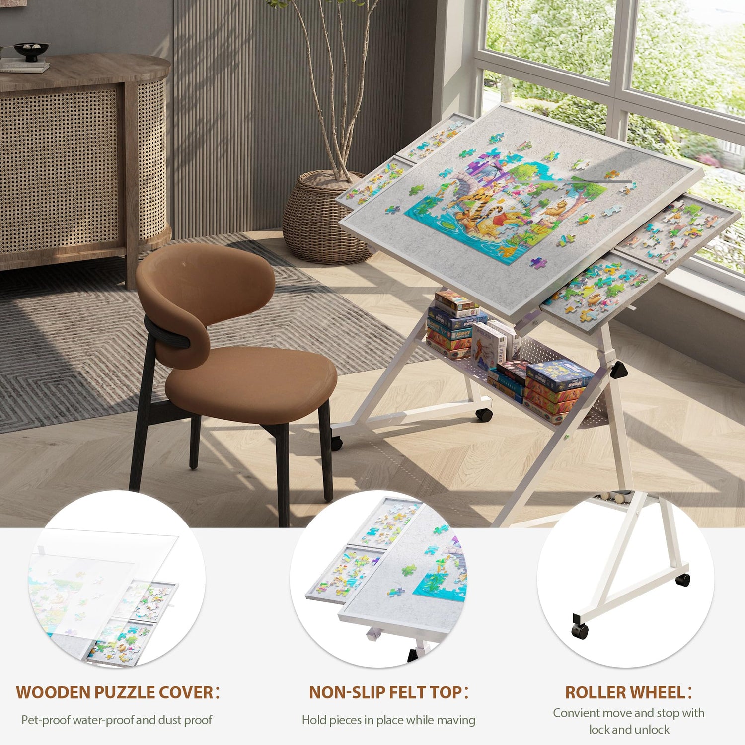 - 4 Drawers & 1 Metal Shelf: The 4 sliding gray felt drawers help you sort puzzles by color, theme, or border, keeping your pieces organized while assembling. Each drawer has handles around the table to ensure the drawers stay closed during movement, preventing puzzle pieces from getting lost. Below the table, there is a metal storage shelf for storing puzzle boxes, stationery, books, and even to rest your feet to relieve leg and hip pressure.
