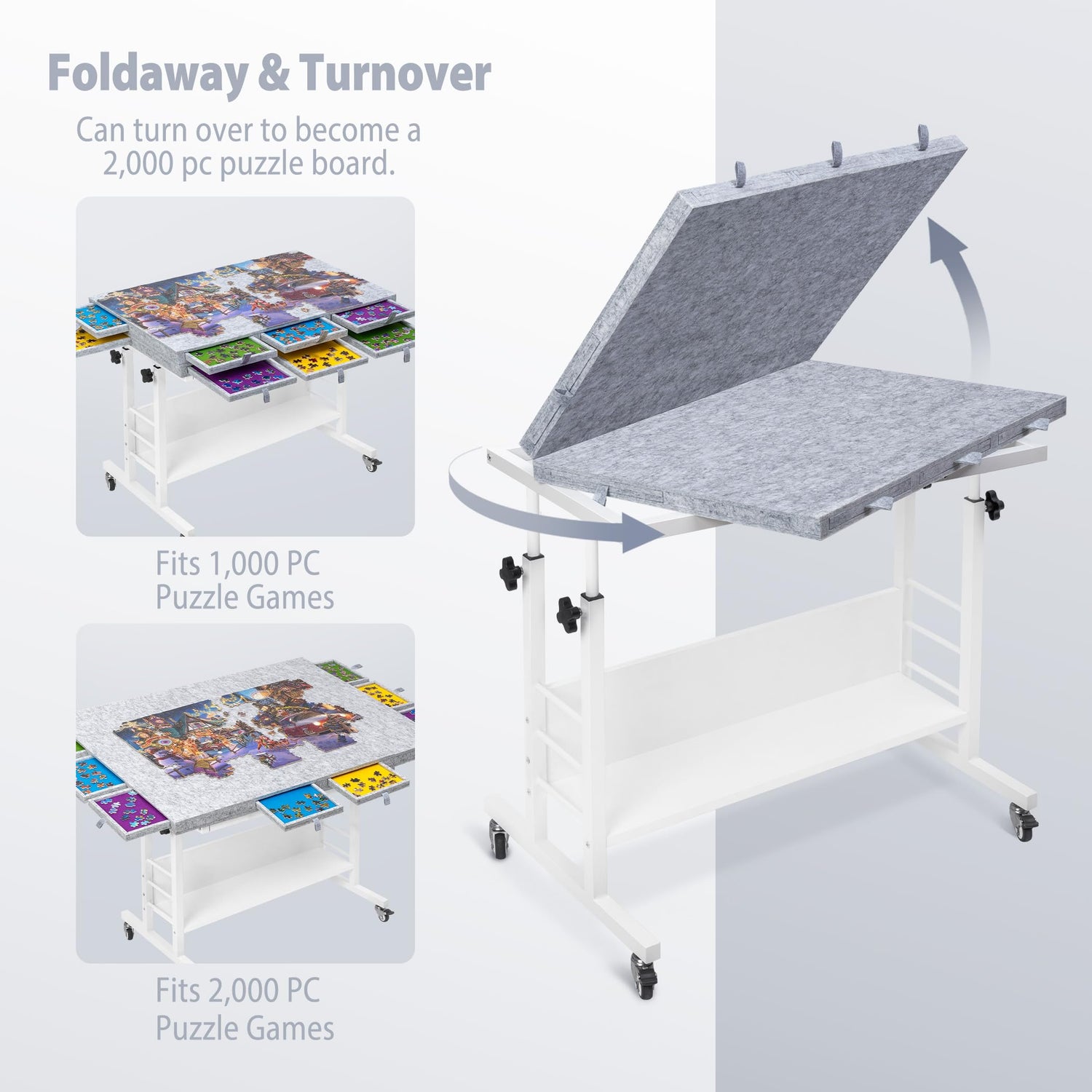 - Unique Folding & Reversible Design - Our puzzle table flips and converses into a dedicated 2,000-piece puzzle board – expanding to a generous 40.2 x 29.9 inches (approx. 102 x 76 cm). This spacious surface comfortably accommodates puzzles of 2000, 1500, 1000, or 500 pieces, perfect for enjoying puzzling sessions with family or friends.