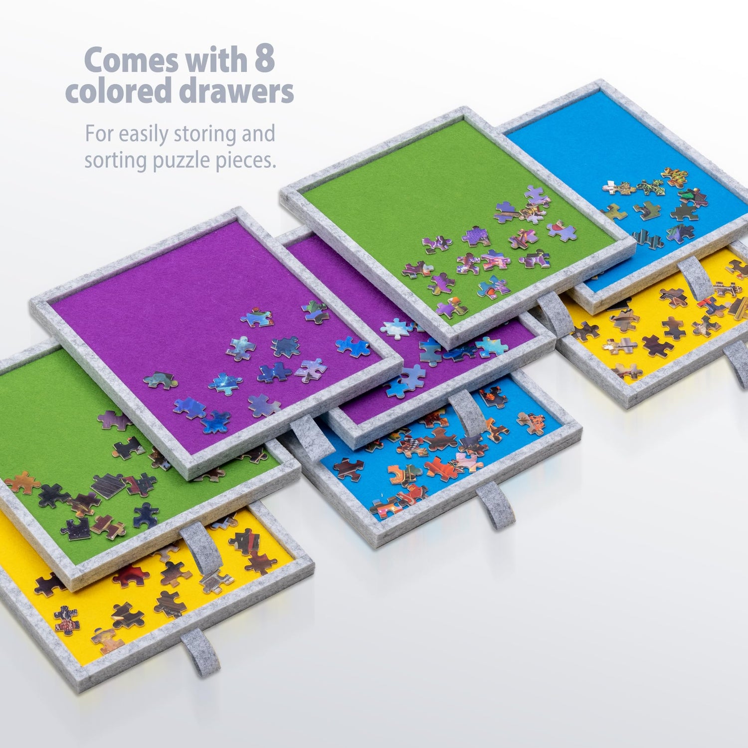 - Features 8 Drawers & 4 Casters - Keep your pieces organized with the 8 sorting drawers that allow you to sort by color, shape, or pattern to speed up assembly. The bottom shelf offers extra storage space for puzzle boxes or other items. Four lockable wheels enable you to easily move the table anywhere you like and ensure stable placement.