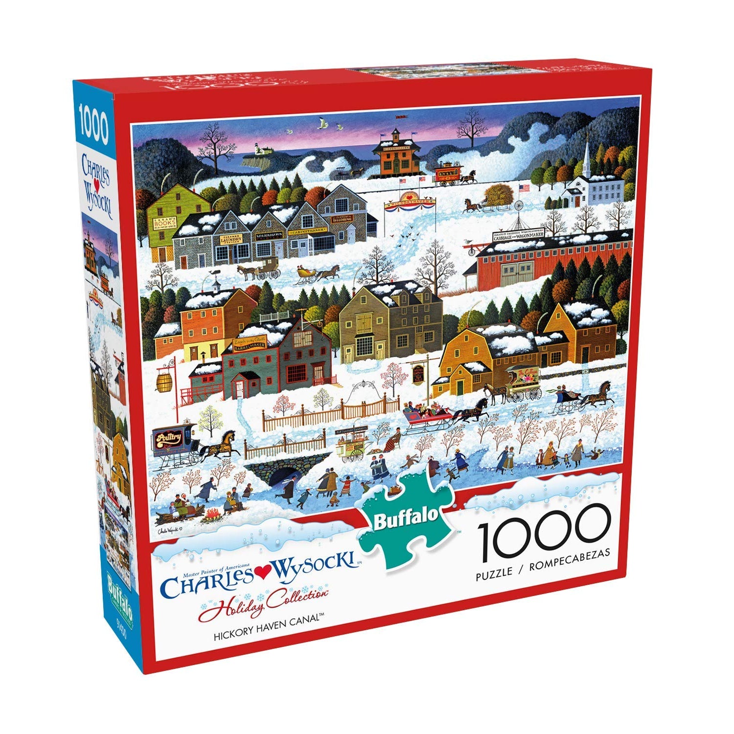 Details: The ideal winter town is here, in Hickory Haven Canal, where you will spot a horse-drawn sled carrying its townspeople, and dozens ice skating on the frozen lake. Hickory Haven Canal is a 1,000 piece jigsaw puzzle by artist Charles Wysocki. For more than 40 years Charles Wysocki enjoyed his love affair with life and Americana, and through his imaginative and colorful artwork, touched the hearts of millions worldwide. "Chuck" felt a special kinship with puzzlers who share in the creative process by building his paintings one piece at a time. Every Buffalo Games jigsaw puzzle is manufactured from recycled puzzle board. A precision cutting technique guarantees that every piece will fit soundly with the company's signature Perfect Snap™. A bonus puzzle poster is also included so that you have a handy reference of what the completed puzzle should look like while you put yours together.