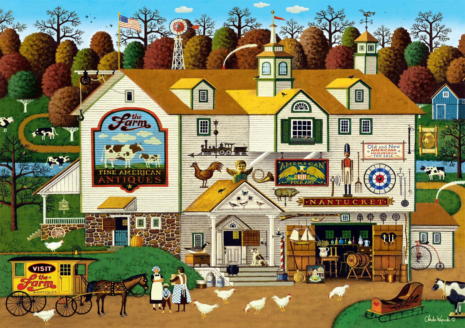 Details: This 500-piece jigsaw puzzle by Buffalo Games is from the Americana Collection and is titled "The Farm". It features art by Charles Wysocki depicting "The Farm", a huge antiques barn in Nantucket. Cows are grazing in the surrounding countryside and trees are displaying their fall foliage. Every Buffalo Games jigsaw puzzle is manufactured from recycled puzzle board. A precision cutting technique guarantees that every piece will fit soundly with the company's signature Perfect Snap™. A bonus puzzle poster is also included so that you have a handy reference of what the completed puzzle should look like while you put yours together.