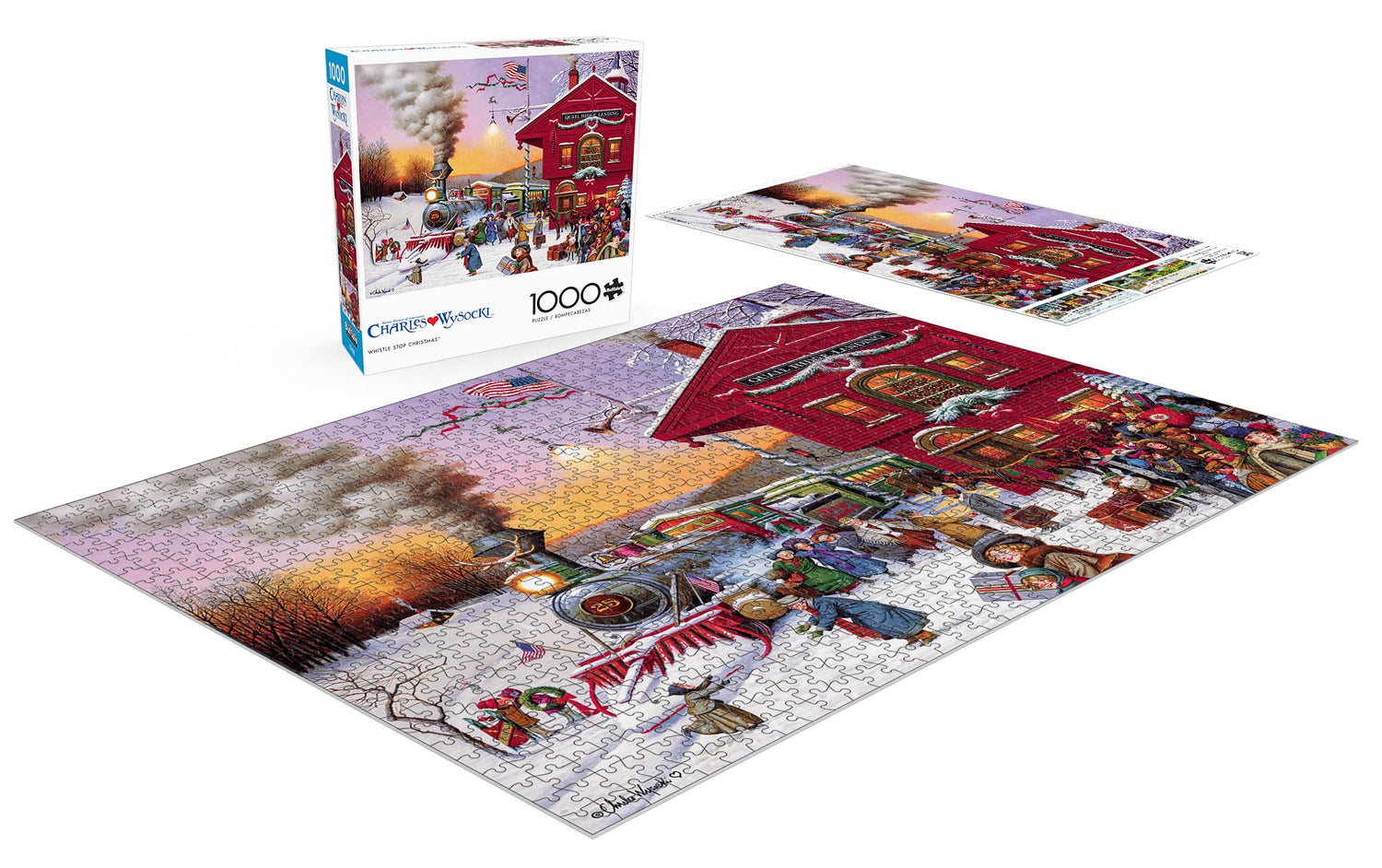 Details: “Whistle Stop Christmas” by Charles Wysocki is a delightful 1000-piece jigsaw puzzle from Buffalo Games. Travelers coming and going gather at the Quail Ridge Landing train station with luggage and Christmas presents as they prepare to spend the holidays with family and friends. This nostalgic throwback to the days of steam engines and locomotive travel will make you long for a simple, classic Christmas of your own. For more than 40 years Charles Wysocki enjoyed his love affair with life and Americana, and through his imaginative and colorful artwork, touched the hearts of millions worldwide. "Chuck" felt a special kinship with puzzlers who share in the creative process by building his paintings one piece at a time. Every Buffalo Games jigsaw puzzle is manufactured from recycled puzzle board. A precision cutting technique guarantees that every piece will fit soundly with the company's signature Perfect Snap™. A bonus puzzle poster is also included so that you have a handy reference of what the completed puzzle should look like while you put yours together.