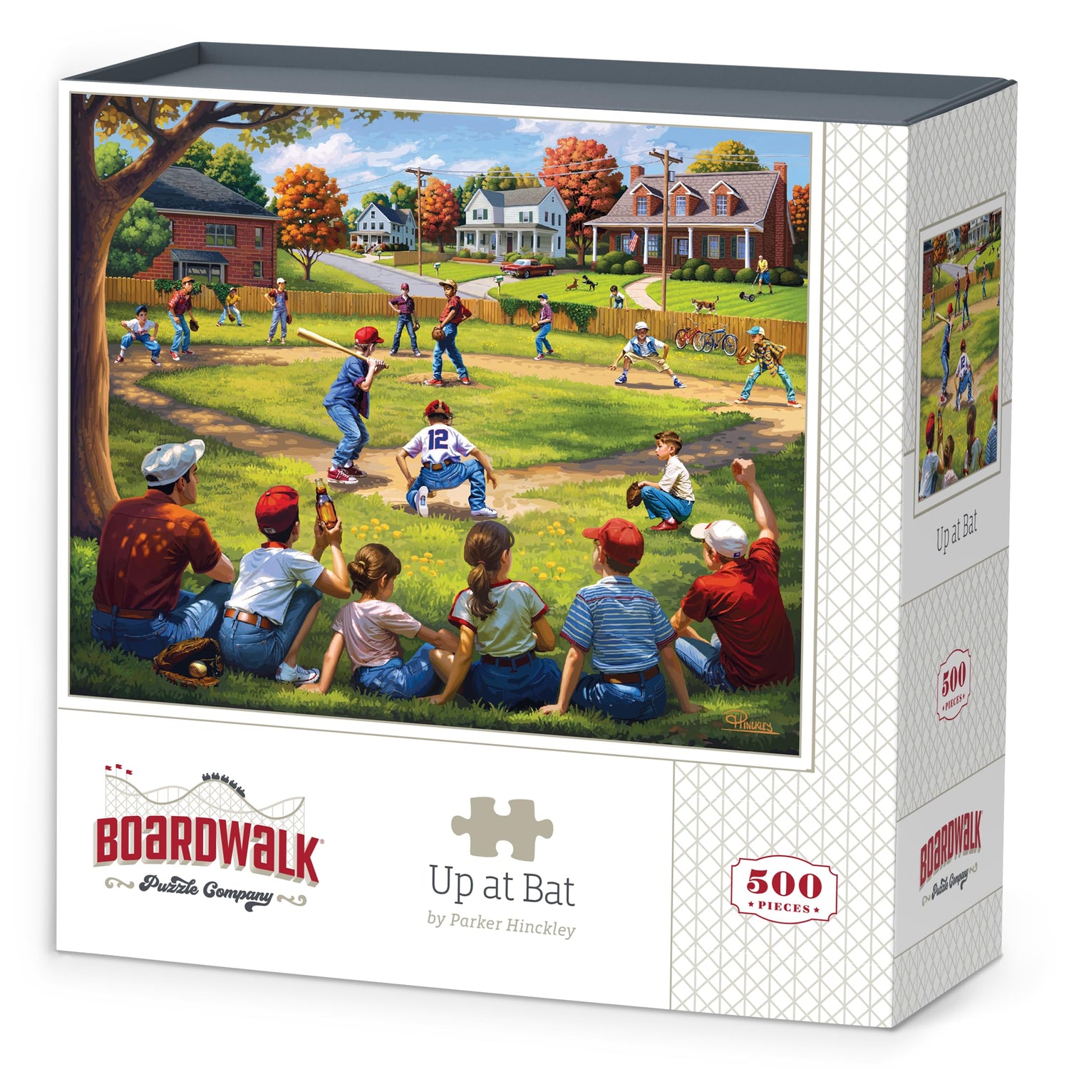 Details: Up at Bat by Parker Hinckley This is a quintessential scene of Americana. Kids of all ages gather in a vacant lot with well-worn gloves, wooden bats, and scuffed baseballs to play their favorite game. Infielders taunt a young batter ready to give his all for his friends. Other players look on hoping the little slugger will at least get to first. The air is filled with excitement. There are two outs and a runner on third. Everything is riding on the next pitch. This puzzle is part of our Outdoor Adventure Collection. Boardwalk traditional puzzles are proudly manufactured in the U.S.A. from domestic and imported materials. Our jigsaw puzzles are made with premium Eska puzzle blue board produced from 100% recovered paper. Each puzzle comes in a collectable box with magnet close, includes a full-color reference poster, and contains resealable bag for puzzle storage. Boardwalk traditional puzzles are precision cut to fit tightly and “snap” together.