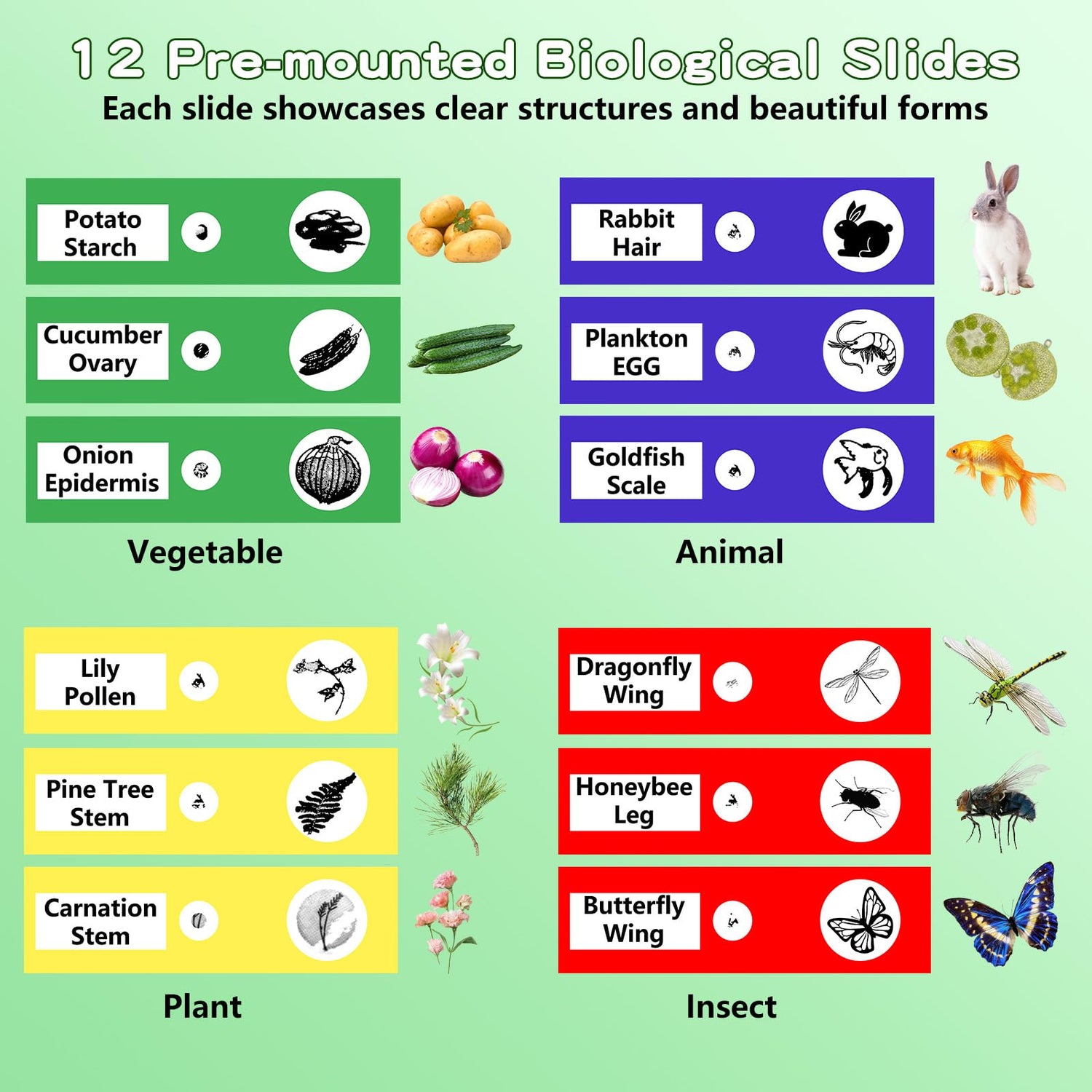 - 12 Extra Slides & Perfect Gift: Includes 12 carefully selected plastic slides covering four categories: plants, vegetables, insects, and animals. Each slide showcases clear structures and beautiful forms, blending education with fun. This toys for ages 5-7 set is both entertaining and educational, making it an ideal gift for boys and girls aged 3 to 12 on birthdays, holidays, Christmas, or as a learning reward.